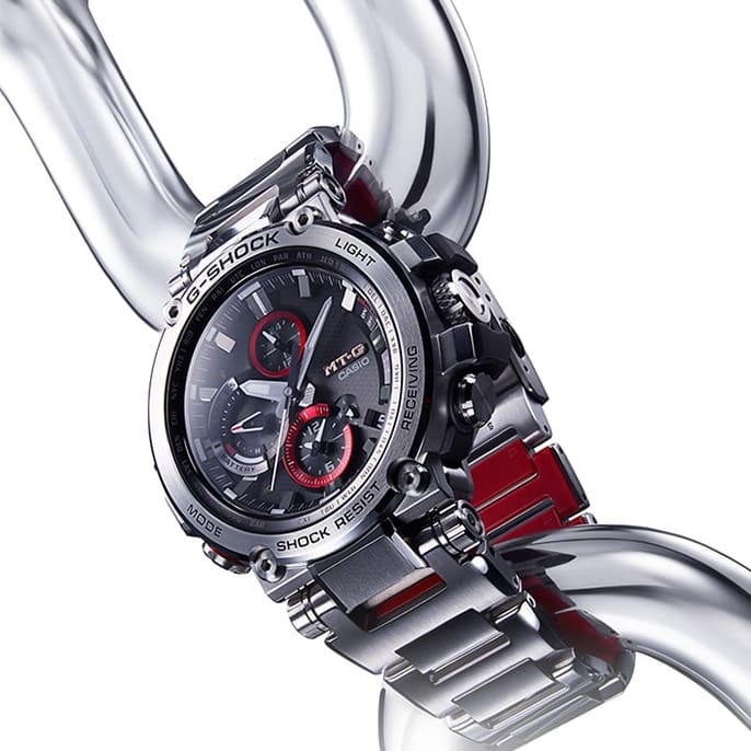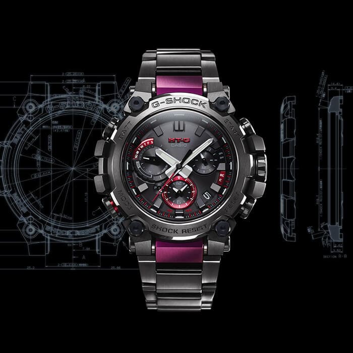 カーボンファイバー強化樹脂製のインナーケースをメタルパーツで保護するMT-G独自のデュアルコアガード構造により、高強度と軽量化を同時に実現。G-SHOCKが定めるTRIPLE G RESIST(耐衝撃構造・耐遠心重力性能・耐振動構造)の基準をクリア。