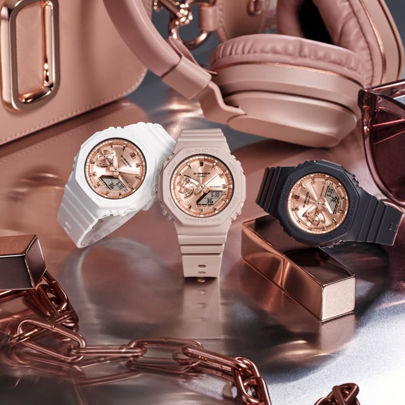 ピンクゴールド&ベージュピンクが好相性。ひとまわり小さなメタルカバードG-SHOCK。
