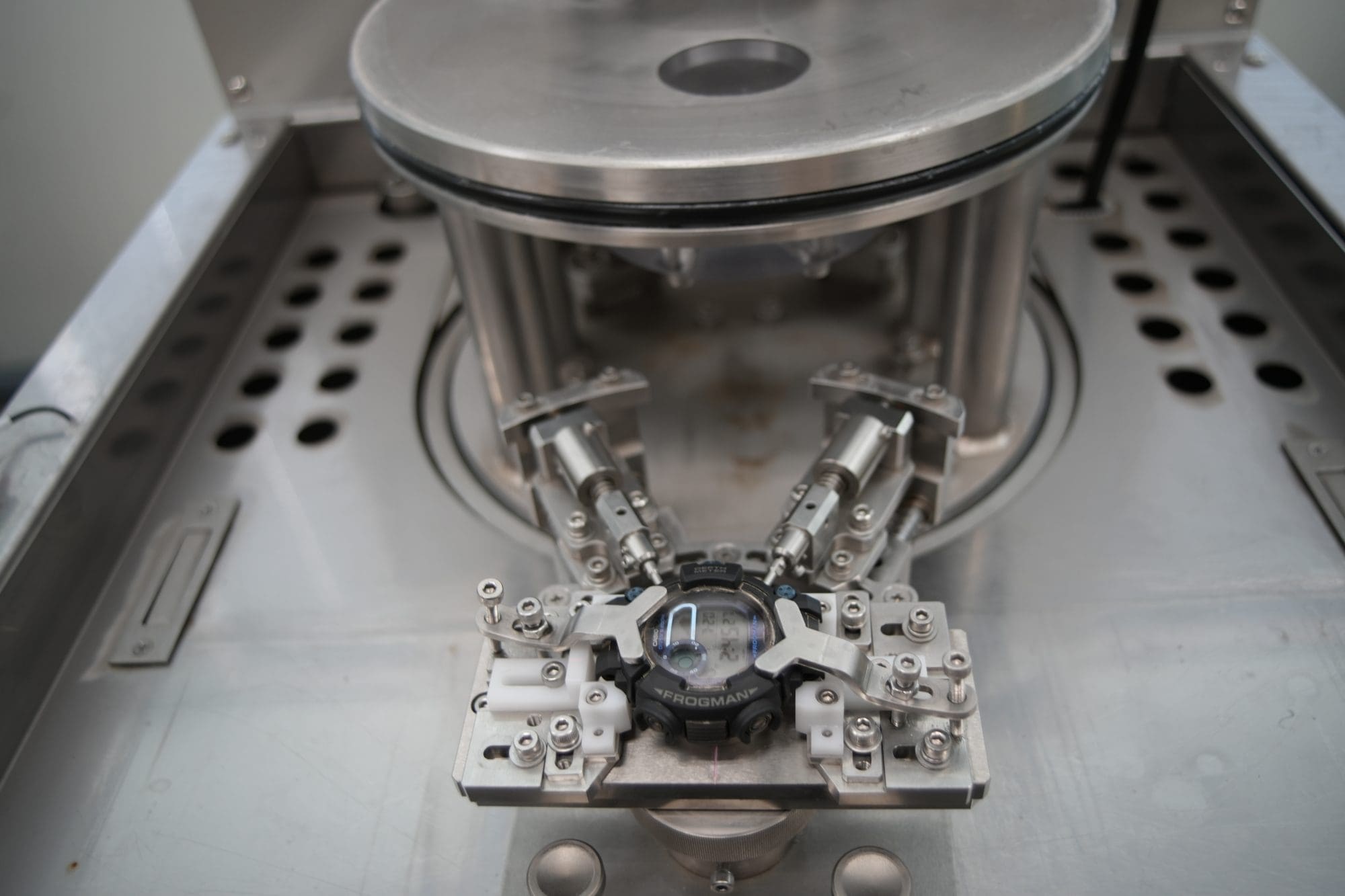 そのころ日本では、しっかりした防水試験機が見つからなかったので、羽村技術センターが導入したのは、たしかドイツ製だったかと思います。でも、フロッグマンは規格外の大きさだったのか、その防水試験機に入りませんでした。防水テストの前に防水試験機をカスタムして、フロッグマンに対応させる必要があったのです。