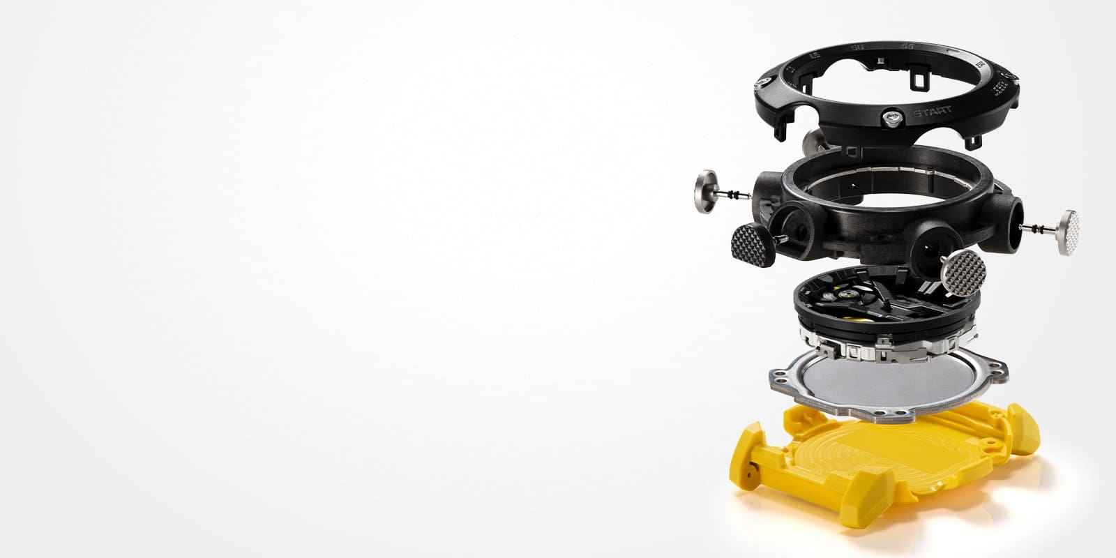 ប៊ូតុងដ៏ធំមួយដែលបានដាក់នៅទីតាំងម៉ោង 6 នៅលើប្រអប់មានមុខងារបើកពន្លឺ និងបង្ហាញឱ្យឃើញច្បាស់ពីការរចនាដ៏រឹងមាំ។