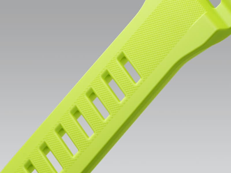 사용된 재료의 부드러움으로 더욱 편안한 착용감을 느낄 수 있습니다. 웨이브 모양의 형태는 밴드가 피부에 밀착되지 않도록 합니다. 러그에는 통기성을 제공하기 위한 통풍 부품이 있습니다. 부드러운 우레탄 밴드는 착용감이 개선되었고 밴드 홀이 많기 때문에 길이를 정밀하게 조정할 수 있습니다.