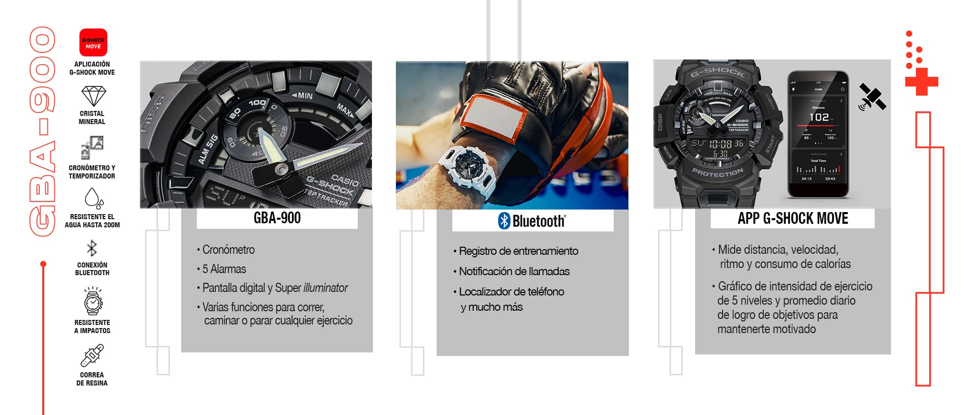 La conexión vía bluetooth con la app G-Shock Move proporciona un registro de datos preciso y eficaz, en datos como el ritmo cardiaco y evita oscilaciones y variaciones que suelen presentar competidores de última generación. Esto combinado con una práctica y particular función de movimiento de agujas, resulta muy útil, ya que se acomodan para dejar ver con claridad la información de la pantalla.