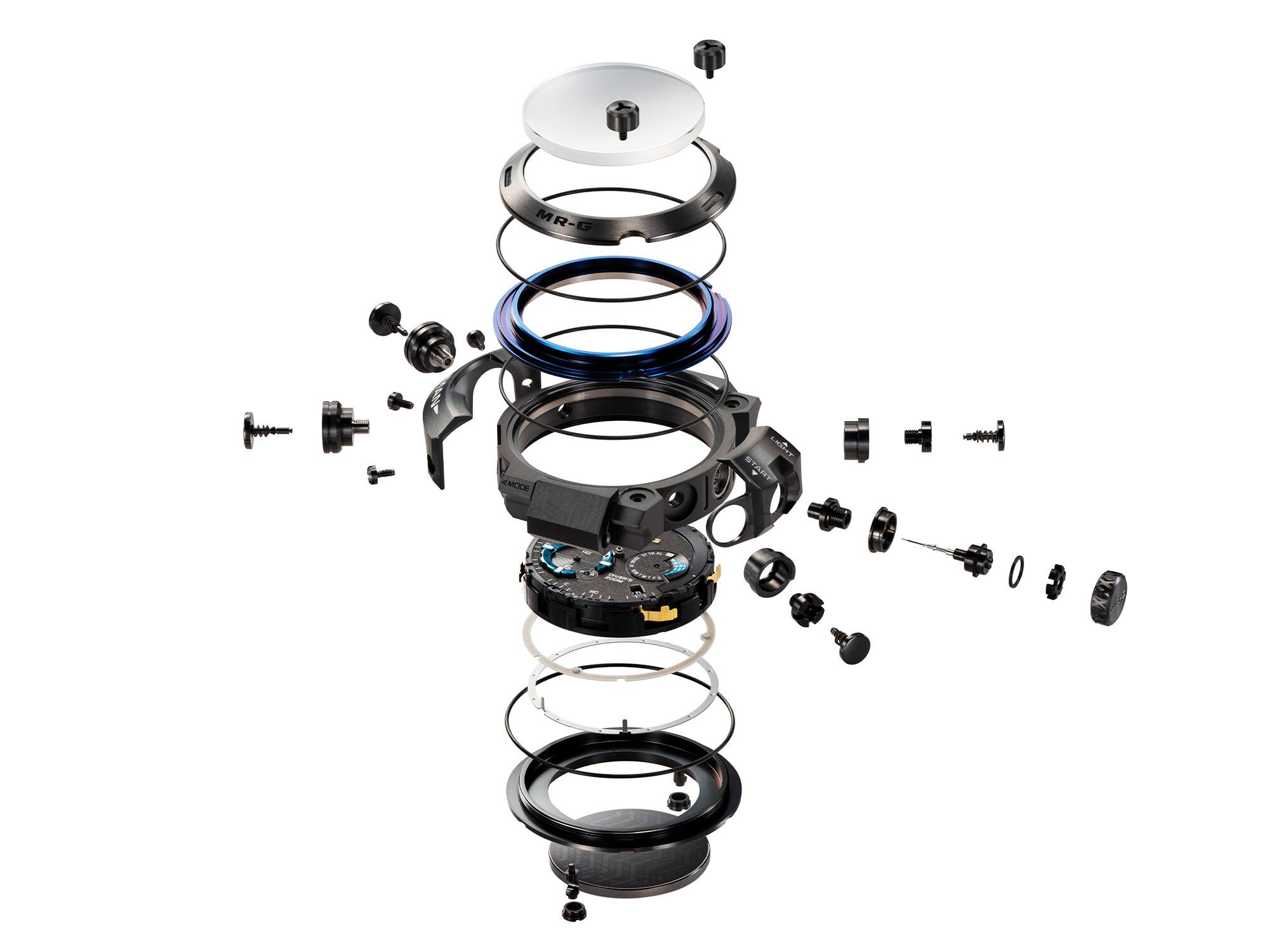 Se utiliza titanio ligero y resistente al óxido en los componentes exteriores clave: desde la carcasa y su parte posterior y el marco hasta la corona, los botones y los tornillos. El reloj está fabricado con una intrincada combinación de más de 70 componentes exteriores, por lo que logra una forma potente y atractiva. La estructura ofrece una función de protección de la esfera con amortiguadores hechos de caucho fluorado instalados en el espacio entre el marco y la carcasa. Un proceso de endurecimiento profundo de capas y el recubrimiento de DLC proporcionan una durabilidad y resistencia a la abrasión aún mayores. En la carcasa se incorpora una corona y una parte posterior que cuentan con una estructura atornillada. Estas y otras características en el diseño permiten que el reloj sea hermético a fin de garantizar la resistencia al agua durante el buceo.