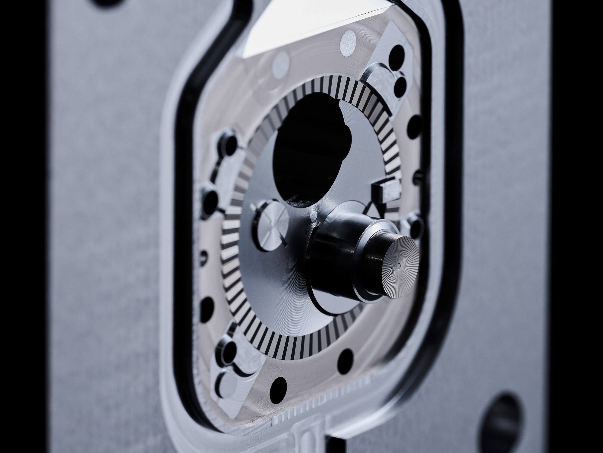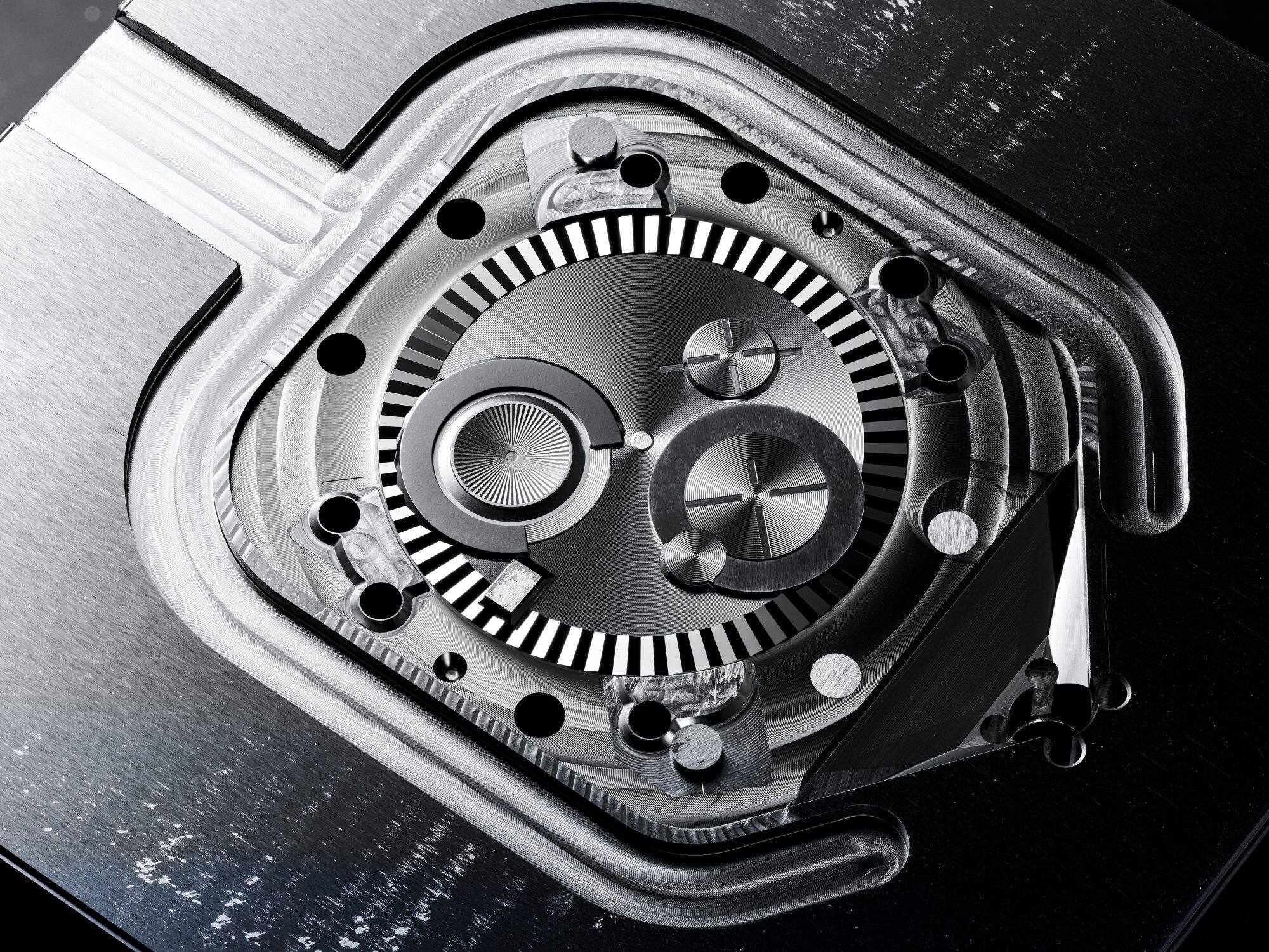 Otra tecnología detrás de la impresionante precisión de los relojes MR-G es el mecanizado por descarga eléctrica de hilo (WEDM). Esta tecnología se emplea para lograr un procesamiento de precisión, utilizando un hilo para aplicar corriente eléctrica a los componentes que se cortan a intervalos de apenas dos o tres micras. Con este proceso, por ejemplo, si se corta una forma del centro de un bloque de metal y, luego, se vuelve a insertar en el bloque, a simple vista solo se ve una superficie lisa; el hueco donde se cortó es invisible. Este tipo de sofisticadas capacidades tecnológicas son la clave de la fabricación del MR-G.