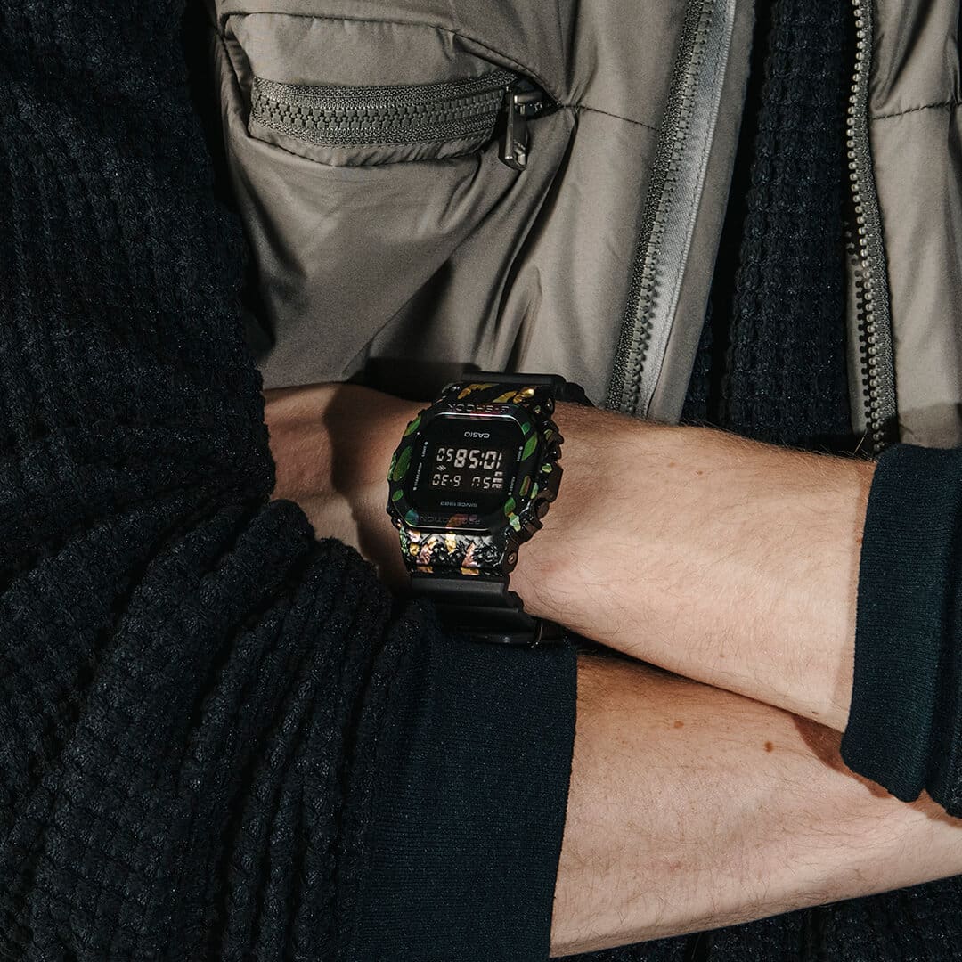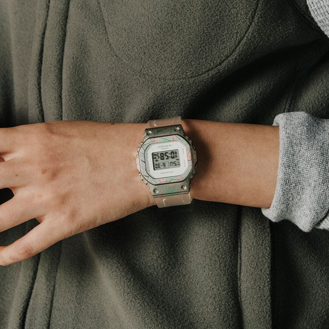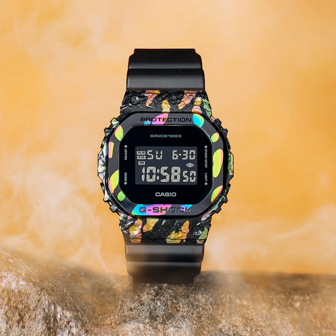 An anniversary logo is engraved on the case back, while the band loop is laser-engraved with four stars and the words “SINCE 1983.” Made with recycled materials, the specially designed eco-friendly packaging is shaped like the G in G-SHOCK.