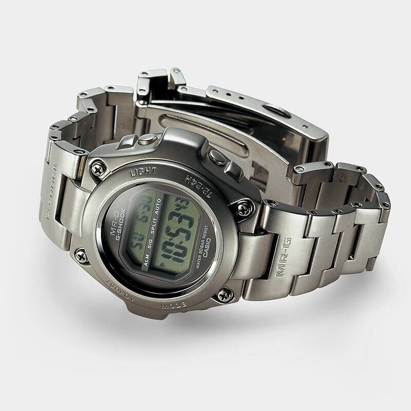 Employing the same hollow case structure for the module that had brought success with the development of the first model, the MRG-100 was heir to the G-SHOCK identity. This time the material used was forge-cast stainless steel. The model came in a full-metal shock-resistant structure made possible by a variety of technological innovations, including a shock-resistant module, bumper construction for the bezel, and a rubber suspension for the case back.