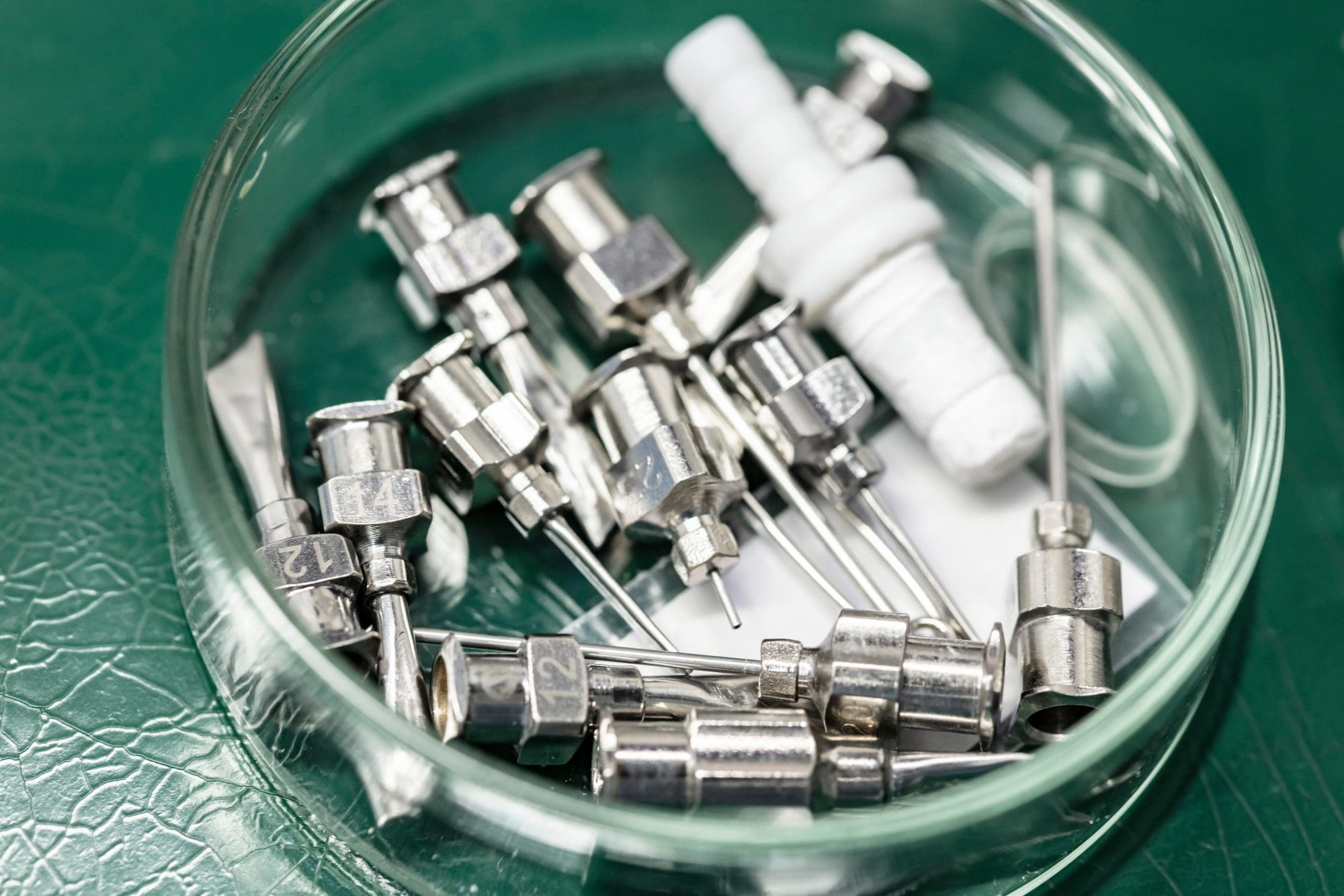 Of course, many luxury watches also have luminescent paint applied by hand. However, in the case of the MRG-BF1000E, all 12 indices are box-shaped and slanted toward the center of the dial, so the technician must apply the paint accurately and quickly, which makes the job much more complicated. While leveling the indices, the technician uses a base coat to enhance the yellow coloring, and after it dries, a layer of luminescent paint is applied. The tricky part here is the shape of the index. In particular, it is challenging to use the exact amount of luminescent paint for the triangular 12 o'clock index, the curved 2 and 4 o'clock, and the 7 and 8 o'clock indices, which have a much smaller area and no edge around them. That is why highly skilled artisans mainly handle the MR-G Frogman's indices. Using a cylindrical needle with a thin, modified tip, a foot pedal controls the amount of paint extracted, and the luminescent paint is carefully applied. The lume is also mixed by the technician at a specialized factory and adjusted depending on the humidity and temperature at the site. Each artisan typically finishes dozens of watches per day.