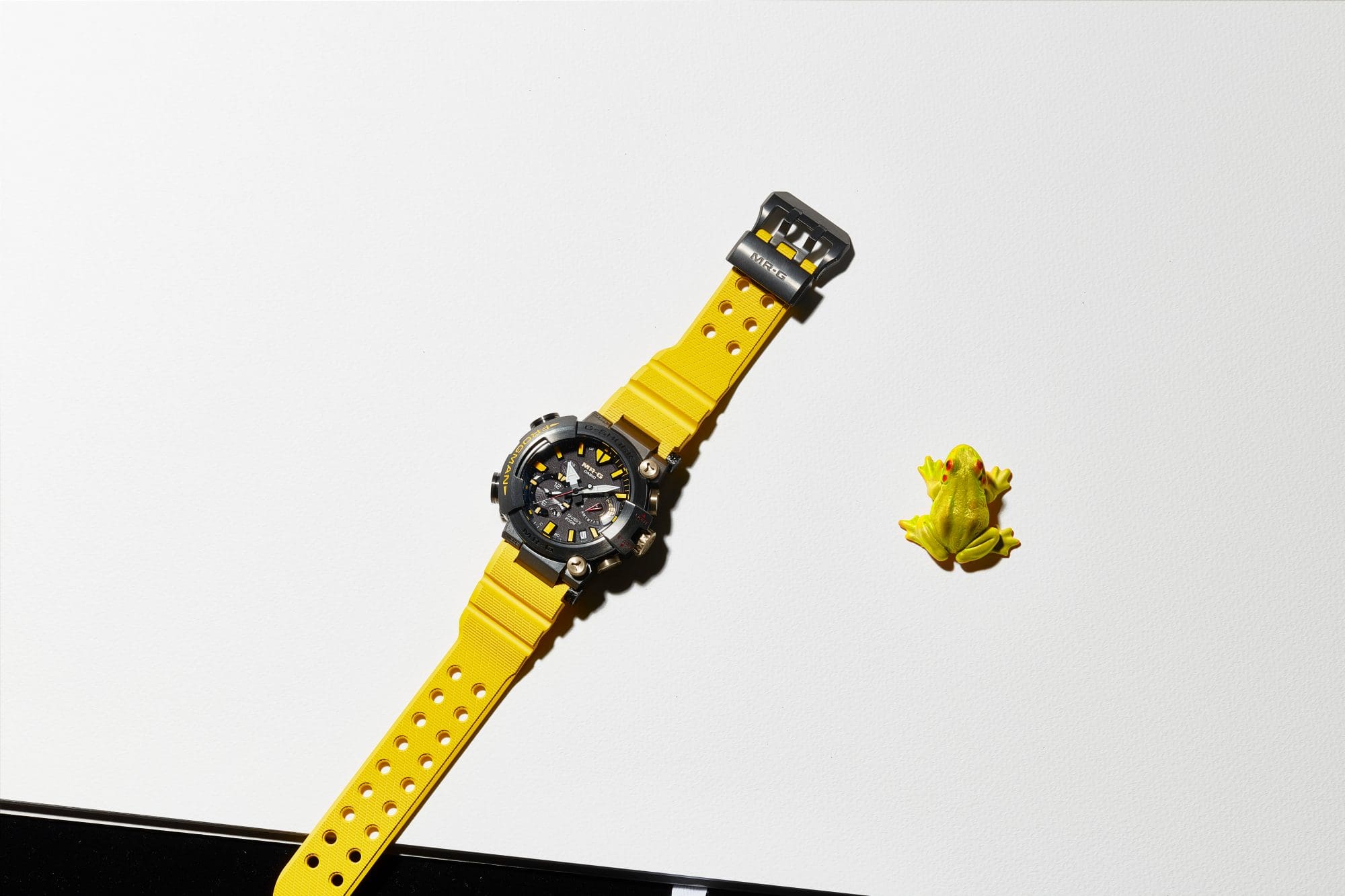 Following the 2022 release of the MRG-B5000, which inherited the ORIGIN design, Casio added the MRG-BF1000R, a development of the Frogman, to its MR-G lineup this past spring. As is the case with the MRG-B5000, the Frogman features a finish befitting the top-of-the-line MR-G lineage, grabbing the attention of G-SHOCK aficionados immediately after its announcement. Now a new version, the MRG-BF1000E, has been added to this series. This model commemorates the 40th anniversary of G-SHOCK and the 30th anniversary of Frogman. This special edition Frogman is the first to feature an interchangeable titanium bracelet and a vivid yellow color that will strike a chord with both old and new fans alike.