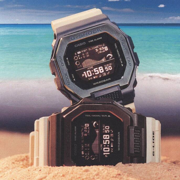 Furthermore, the 70 plus exterior components that make up its complex structure include an O-ring waterproof sealing and a screw-lock construction press-fit sapphire crystal. A huge advantage of this press-fit design is it optimizes the built-in antenna’s radio wave reception sensitivity – this is essential to the G-SHOCK as radio waves help ensure time-telling accuracy. You can switch between current time and elapsed dive time displays easily thanks to three dual-coil motors, and even view your diving times and locations when you pair your Frogman with your Casio Watches smartphone app. The Frogman and Casio Watches app also enable you to view the tide graphs for approximately 3,300 spots around the world. Like other modern G-SHOCK models, the Frogman’s accuracy is ensured by Bluetooth® and radio signals.