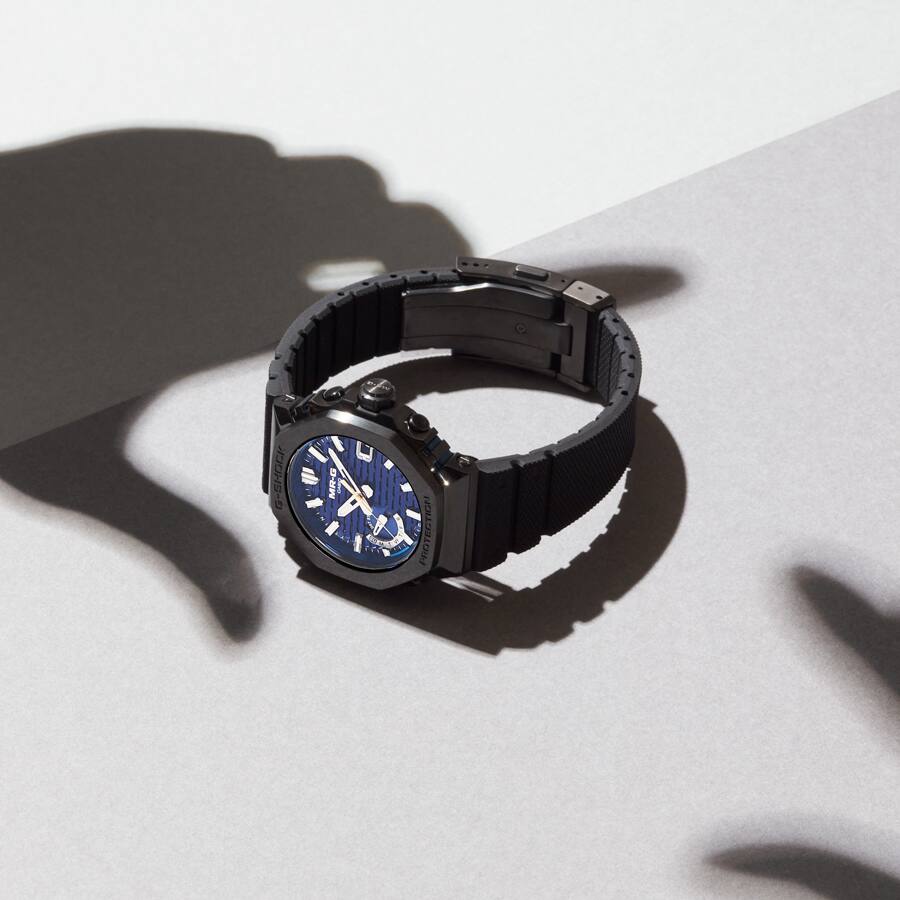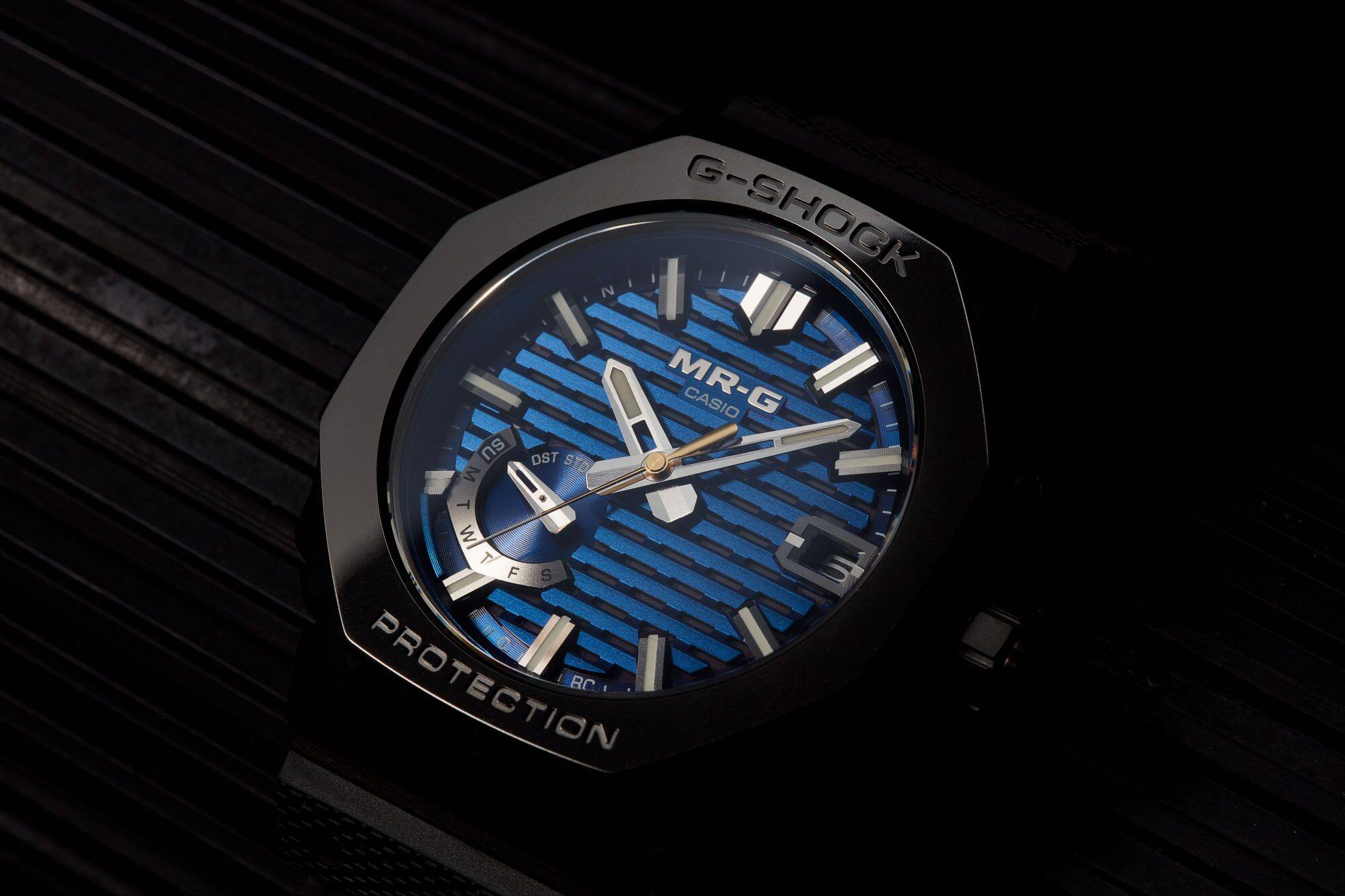 The MRG-B2100R is the latest MR-G model to exemplify CASIO's creative vision and design theme with the "Ao-zumi" (blue ink) color that was featured in the MRG-B5000BA from 2022. Drawing from the traditional Japanese woodworking technique of "kigumi," the dial is finished with blue vapor deposition. This subtle blue hue contrasts with the black exterior, giving the watch a presence that’s both refined and serene.