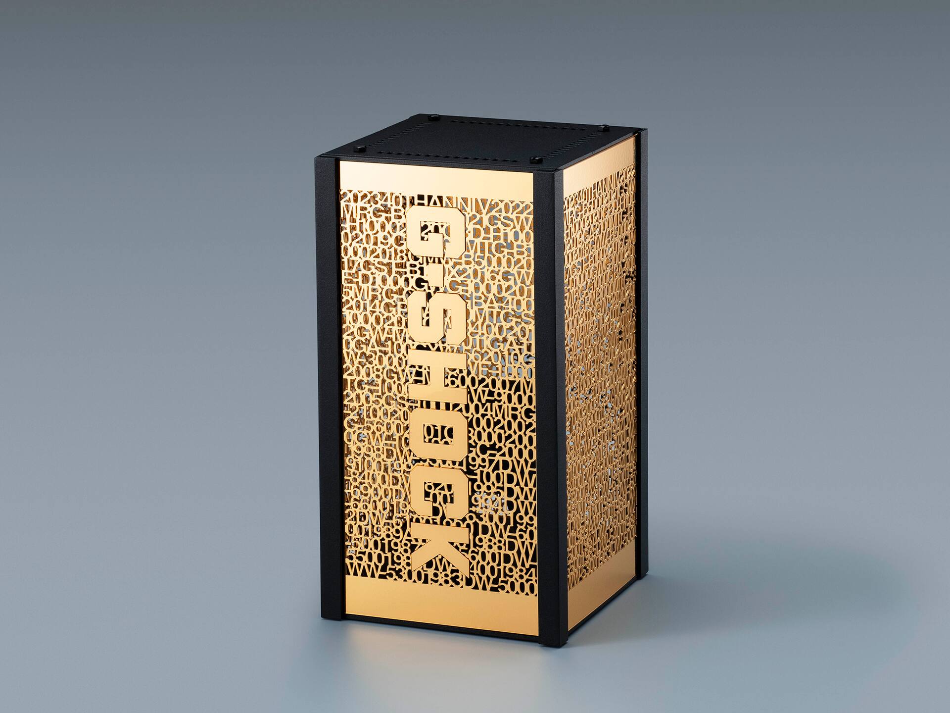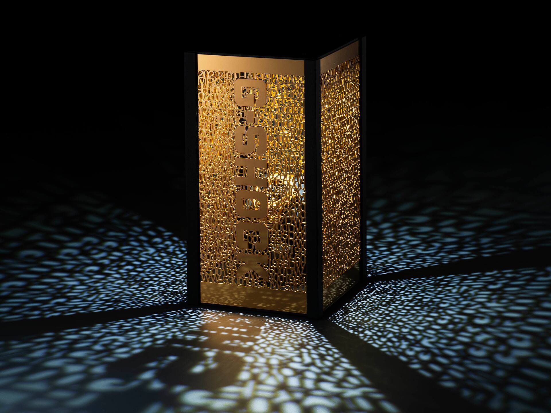 We have prepared a special, one-of-a-kind display for this worldwide limited edition of a single timepiece. Even the packaging had to be worthy of a dream project to commemorate the G-SHOCK 40th anniversary. With its toweresque form, incorporating a front cover designed to slide up to open and down to close, the case features an intricate openwork design adorned with the model numbers of past and present G-SHOCK timepieces. With an LED light housed inside, the display case can also be used to provide indirect lighting in interior spaces, creating a captivating ambience of interwoven shadows and light projecting G-SHOCK history.