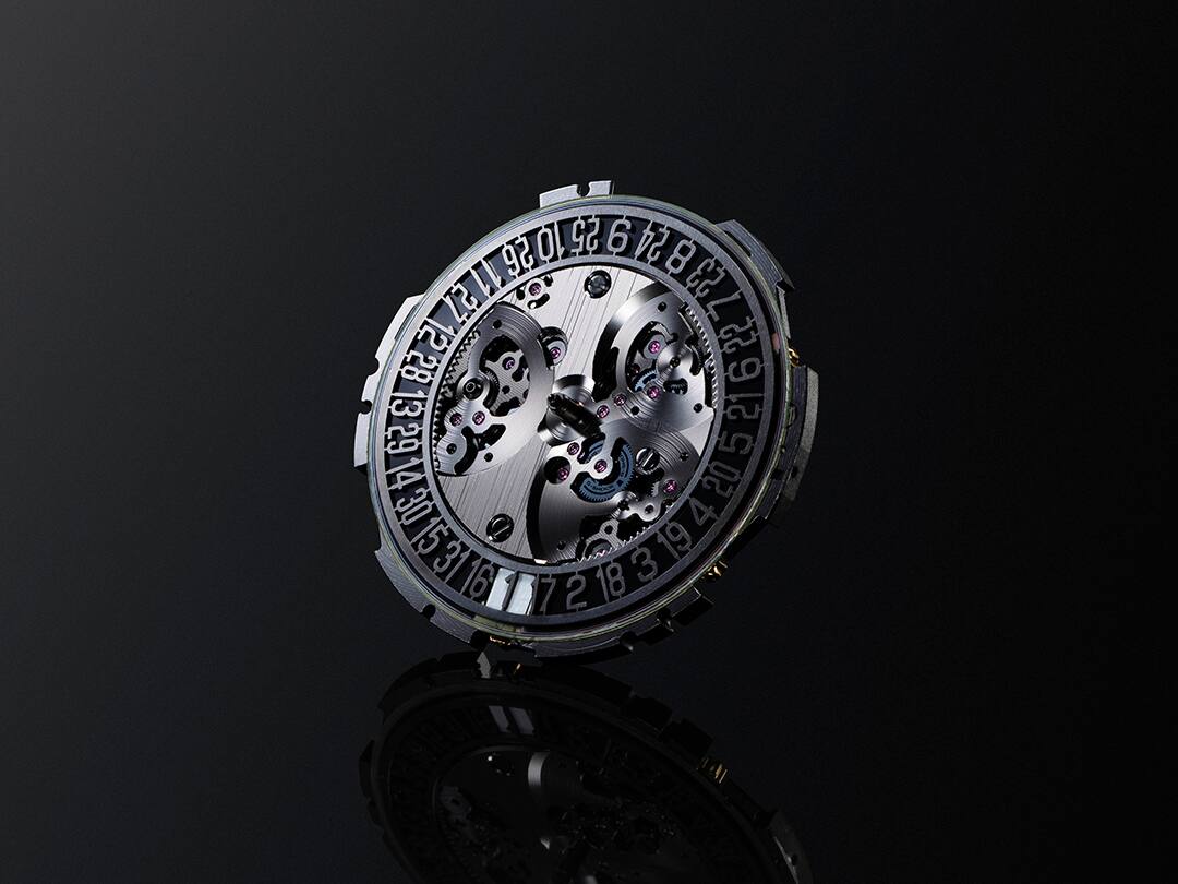 Incorporating bumper components in organic forms, the face of the timepiece features a see-through, dial-less design that lets the internal mechanism show through plainly. Designed specifically for this one model alone, the movement employs a metal main plate, silicone cogwheels, and ruby bearings to enable hand rotation with greater precision. The solar cell, featuring a power-generating layer made with a gallium compound, utilizes a system that applies solar cell technology typically employed in satellites. Leveraging expertise developed by the space industry, this system significantly enhances power generation efficiency compared to traditional solar cells. It harnesses light penetrating through a small gap in the date display to reliably power various functions, including standard time radio wave reception.