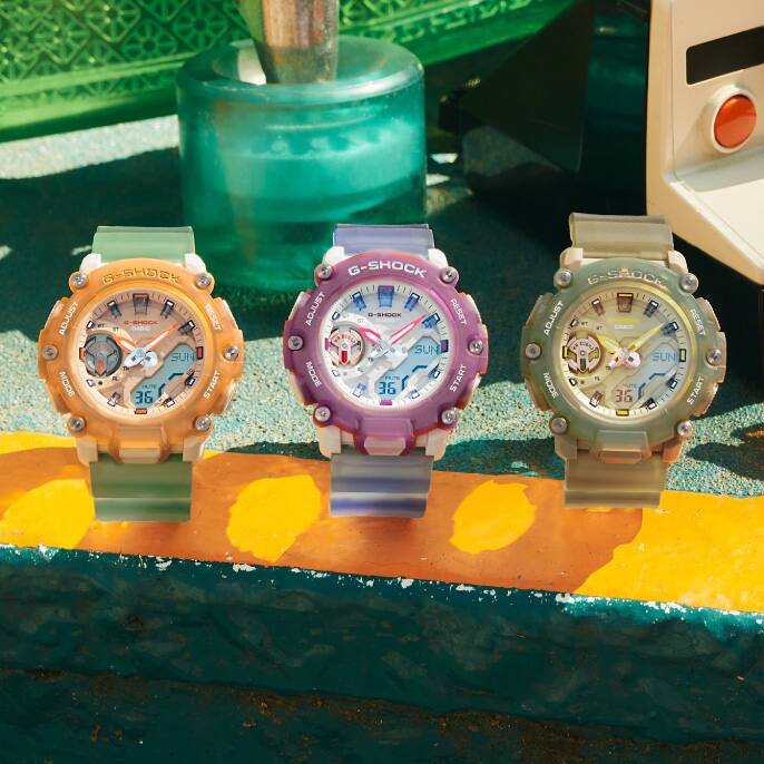 The unique appearance of the hammerhead shark, with its head that protrudes laterally in a “T” shape, appears in silhouette form. A sea-inspired, all-over pattern decorates the face, and the band loop features a die-cut hammerhead shark motif. A silhouette of the shark also appears on the LCD when the backlight is illuminated.