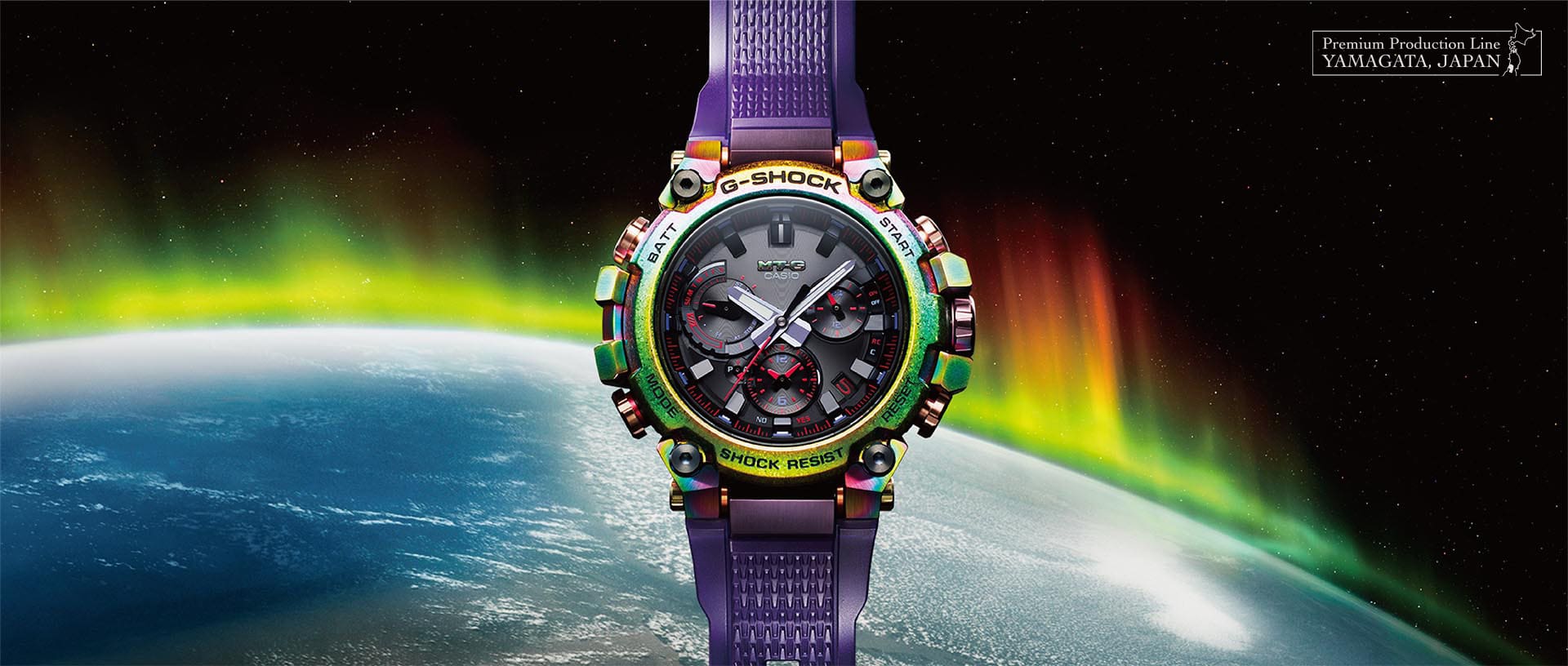 This timepiece radiates with innovative forms of metallic design, all achieved by combining original techniques involving materials, colours, and finishes. The design motif is inspired by the dancing colours of the aurora borealis as seen from outer space. With textures created by stainless steel recrystallisation and deep-layer hardening processes, the mysteriously beautiful radiance of rainbow IP, and more, the watch delivers a truly stunning appearance. Integrating bold vision and meticulously detailed technologies, it presents a profoundly impressive beauty of form like only an MT-G can.