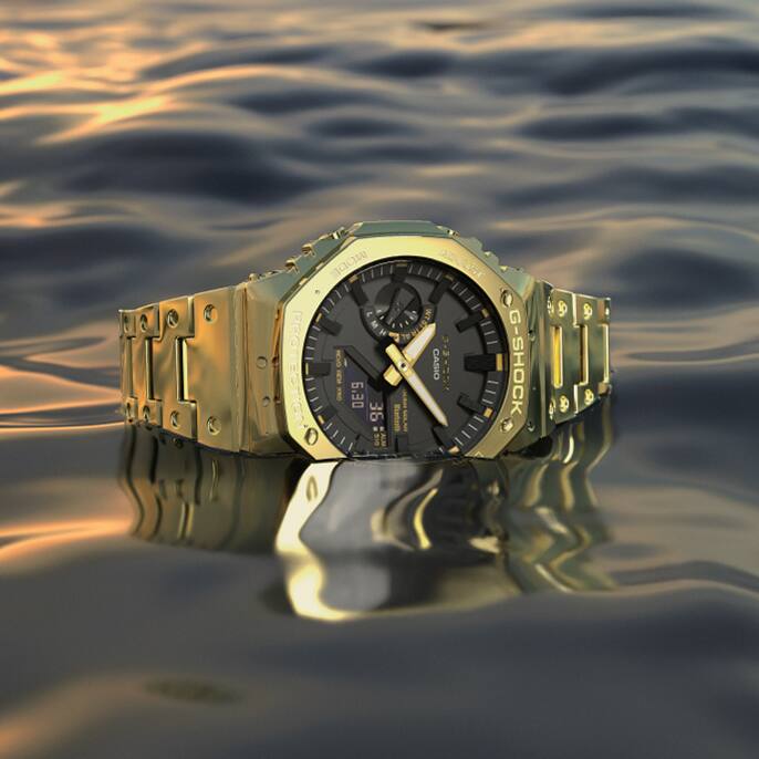 Introducing two G-SHOCK masterpieces with the emblematic streamlined form of the very first model, yet with full-metal exteriors, now featuring striking accents of vibrant blue. Beautiful metallic hues realised with vapour deposition applied to the glass on one model and the dial on the other express a captivating, blue-toned look. Nicely complementing the full-metal exteriors, the accents add a feel of effortless refinement to the solid, toughness-driven design.