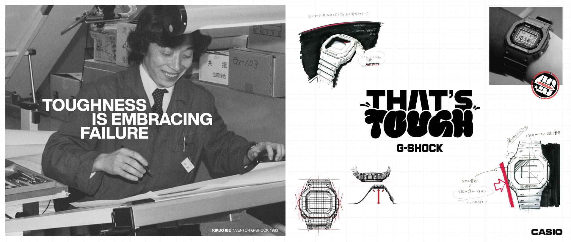 Initially assigned to the Design Department, Ibe was involved in digital watch construction development. In 1981, he proposed a rugged watch that would not break even if dropped and began developing a shock-resistant construction. After two years of hard work, the first G-SHOCK was released. Ibe later oversaw product planning for the MR-G series of G- SHOCK watches with a metal exterior and 18k gold G-SHOCK. While continuing to be active in watch development, Ibe also participates in G-SHOCK events around the world as the father of G-SHOCK, working to expand the global reach of the brand.