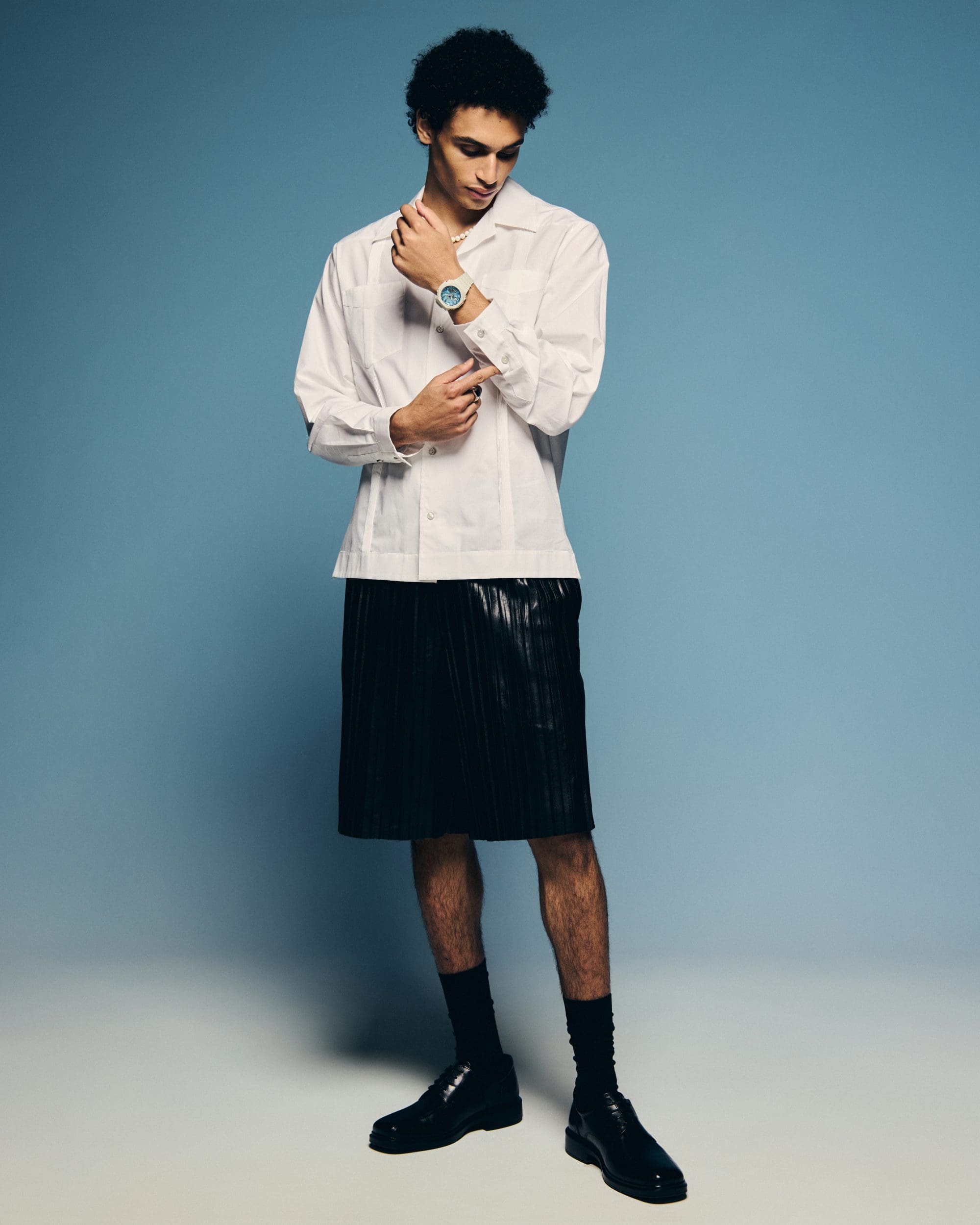 Thematically, the collection nods to the wonders of daytime and nighttime oases, drawing inspiration from desert landscapes, multicolored bodies of water and idyllic natural environments. These visual cues carry over to the dial, hour markers and indices, which feature a soft-washed blue-green gradient, adding cool-toned depth to the watch face.