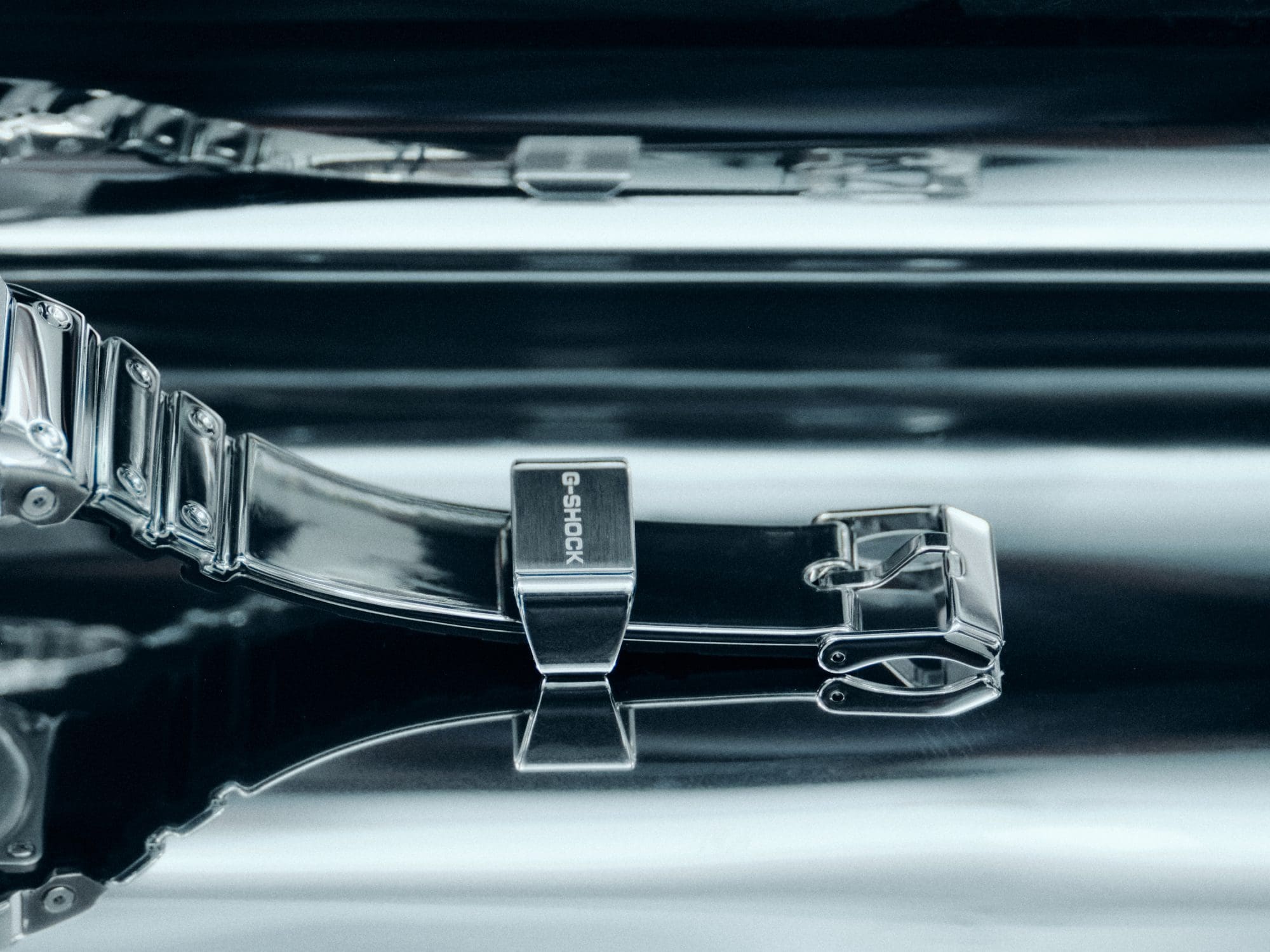 For G-SHOCK, the Tough Silicone Band marks another innovative milestone challenging the harmony between beauty and brawniness. It’s crafted from a multi-layer silicone resin protected by a urethane resin sheet — a translucent top layer with vapor deposition on the underside to create a luminous, metallic finish. Durable yet flexible, the silicone strap obtains the reflective materiality of stainless steel but is more abrasion-resistant and forgiving on the wrist when compared to ordinary silicon. At the watch face, a stainless steel bezel protects the glass fiber-reinforced case, both components meticulously cut and forged to seamlessly provide a sophisticated sense of texture that complements the shimmery strap.