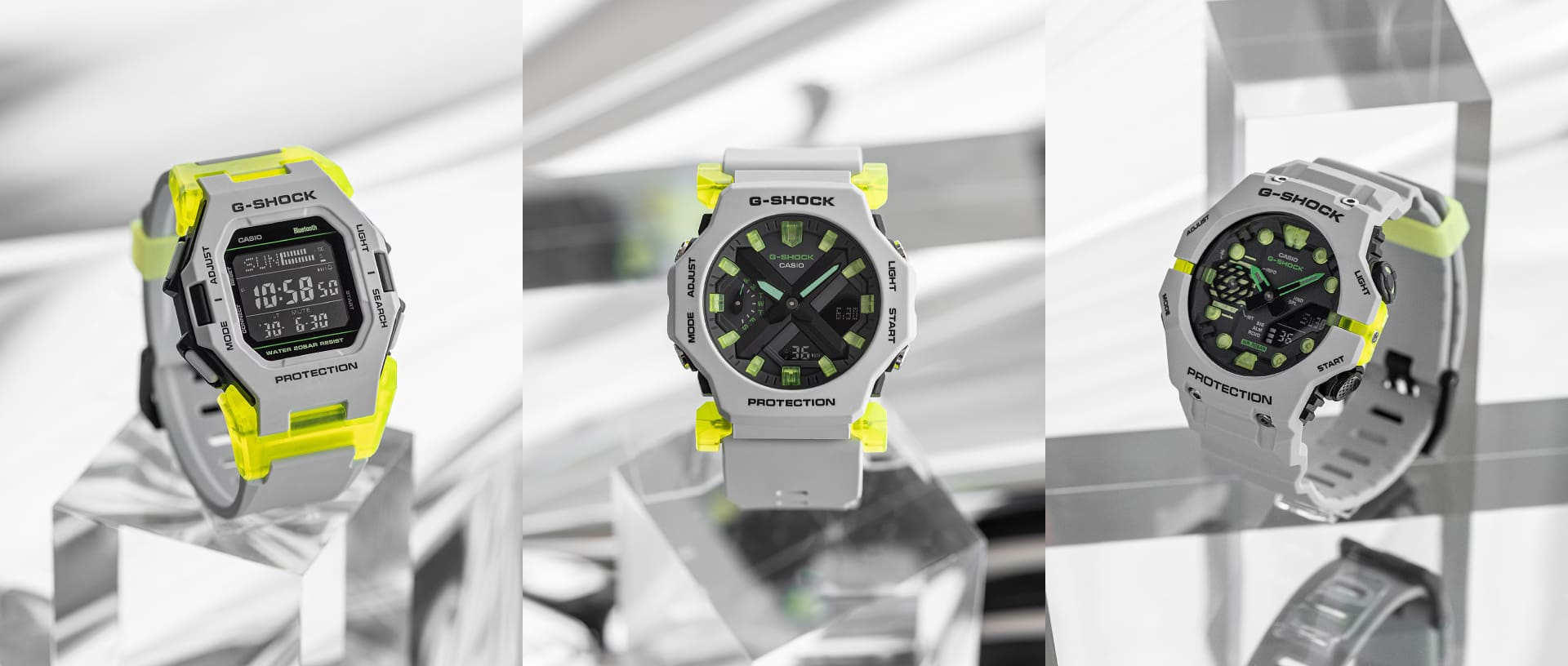 Introducing the Mirror World Series – a bold evolution in design, featuring sleek gray tones complemented by vivid bolt-yellow clear accents. Comprising three standout models— the Bluetooth®-enabled GA-B001, the step-tracking and Bluetooth®-equipped GD-B500, and the minimalist GA-2300— the Mirror World Series draws inspiration from modern sportswear and sneaker culture. The futuristic color scheme seamlessly blends sophisticated grays with vibrant yellow highlights, creating dynamic designs that make a statement. Perfect for both sporty and casual looks, these watches add a cutting-edge flair to any outfit.