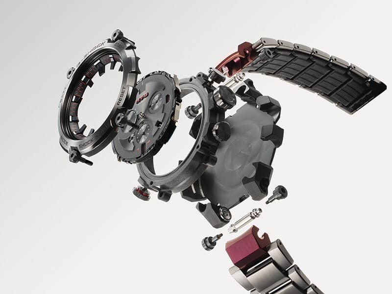 We continue to improve our original MT-G Dual Core Guard structure, now protecting the module with a carbon-reinforced resin case and enclosing the exterior with metal components. At the heart of the new structure is the unique case back, a solid piece of intricately shaped stainless steel. We give it high rigidity using integrated moulding to create a single form with raised sides, which serves as the lugs to secure the band and as the guards for crown and buttons.