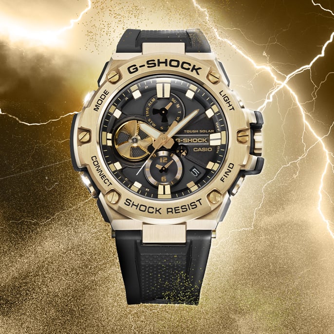 The bezel is crafted from stainless steel and meticulously ion-plated in a glossy gold coating. The contrasting black base drives attention to the facade’s radiant sheen and soft-brushed texture; gold-toned accents adorn the minute and hour hands and push buttons. Each watch is shock-resistant and features 200-meter water resistance.