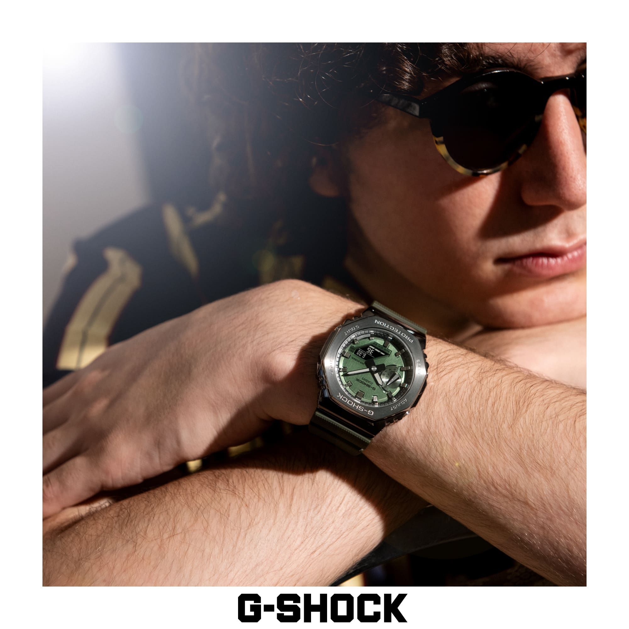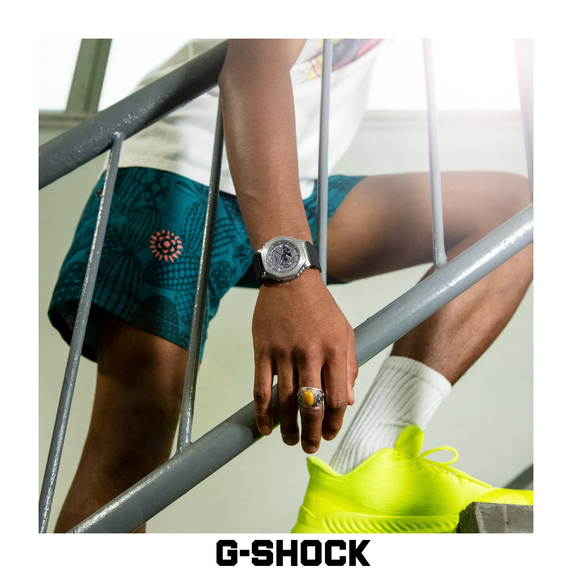 Go sleek, sharp and bold with a G-SHOCK standard-bearer in a metal-clad octagonal take on the original iconic design. Forged in stainless steel with rounded hairline finish, the strong bezel says super style all the way. The dial is treated with vapor deposition finish for a meticulously detailed metallic look that suits a classic metal G-SHOCK timepiece. Incremental variations in the detailed square dot texturing on the wristband take casual urethane materials up a notch.