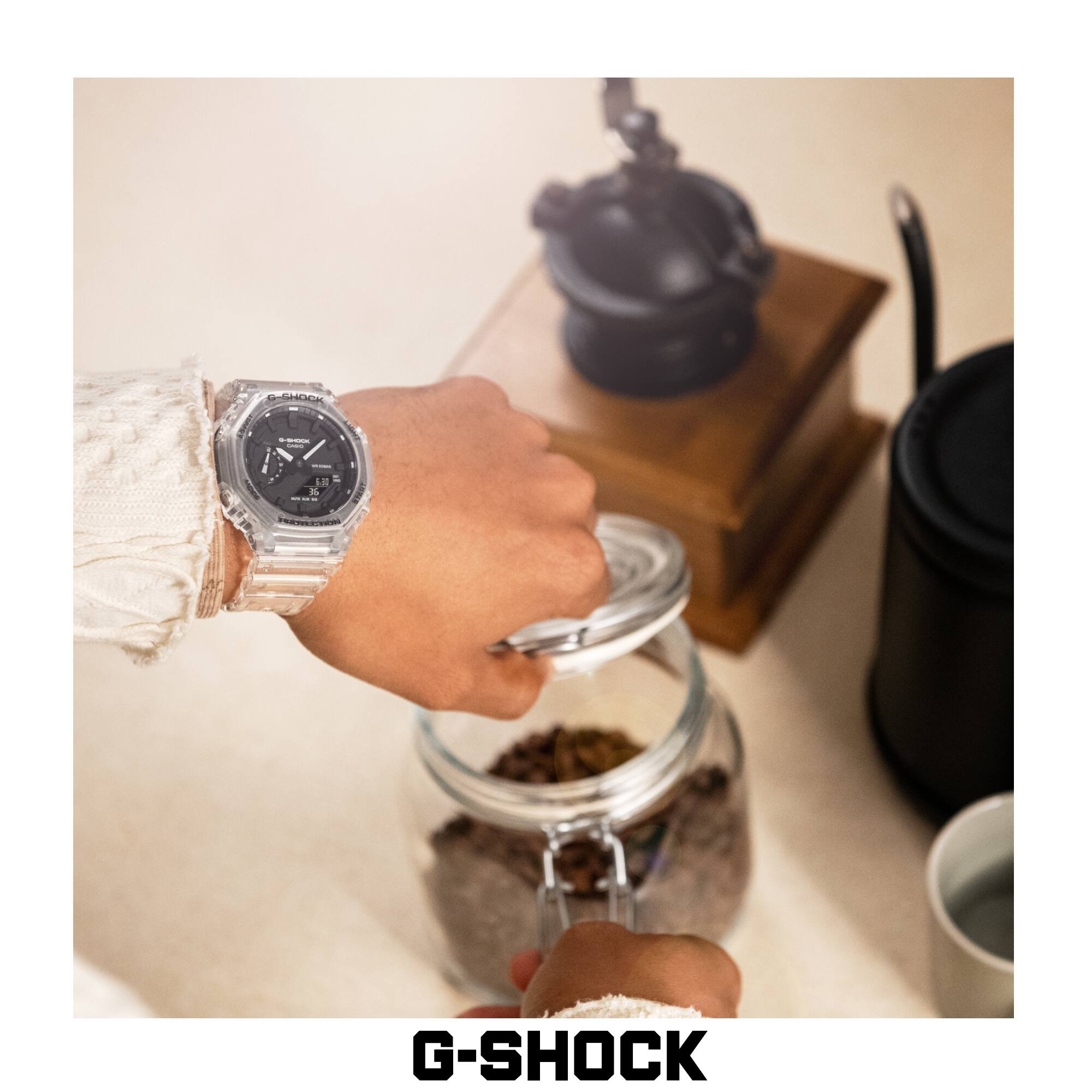 The toughness watches that are ever evolving in an endless pursuit of strength, the skeleton series models are made from translucent resin parts. The coloring is clear with a white base. Based on the popular GA-2100 with its carbon core guard structure and octagonal bezel, this skeleton series model features chic coloring, making it suitable as a fashion item.