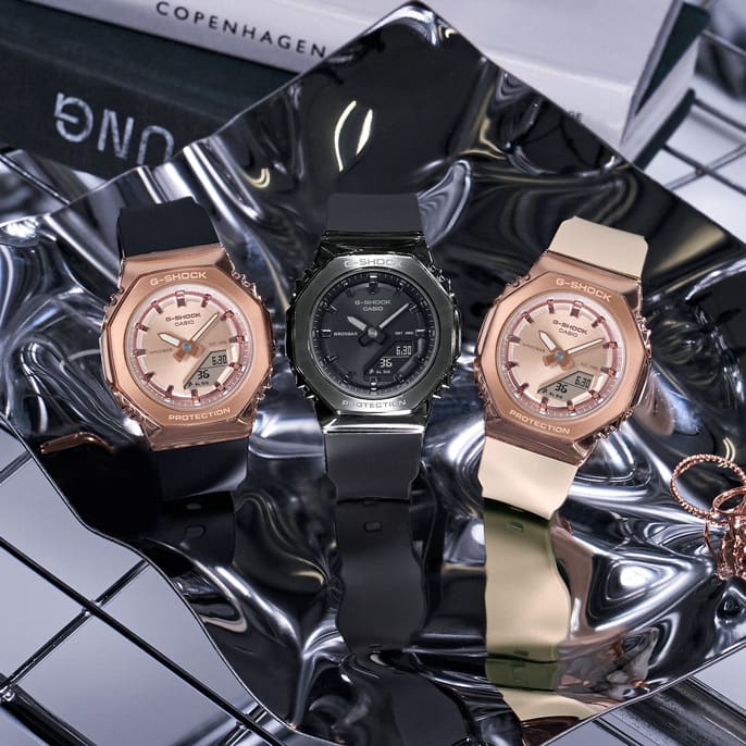 The popular GMA-S110, with its smaller size and unique face design, now welcomes two new colors with the look of elegant silk. Matte-finish pearlescent polarized coatings are applied to the bezel and band, while the dial is finished in matte-metallic, single-tone colors. The captivating colors and gentle shine lend splendor to any outfit.