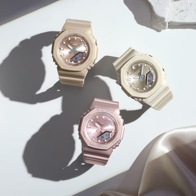 The bezel and band feature pearlescent polarized paint in a matte finish to represent the gentle, luxe texture of silk. The appearance changes depending on the viewing angle, adding a hint of glamour to the wrist. The GMA-S110 now comes in three soft color variations, with new pink and blue now joining easy-to-coordinate white.