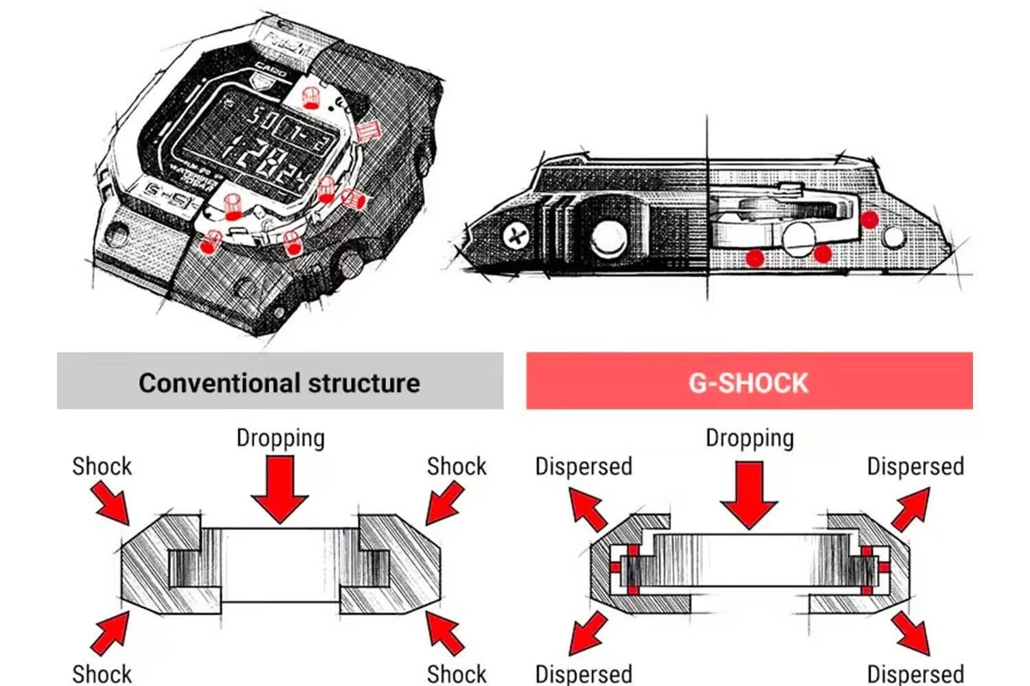 จากนั้นเขาก็ออกแบบโครงสร้างให้โมดูลลอยอยู่ภายในเคส ซึ่งจะช่วยลดแรงกระแทกที่ส่งมาจากภายนอก พบได้ในนาฬิกา G-SHOCK ทุกเรือน และตำแหน่งของจุดกันกระแทกจะถูกปรับแต่งตามวัสดุแต่ละประเภทที่ใช้