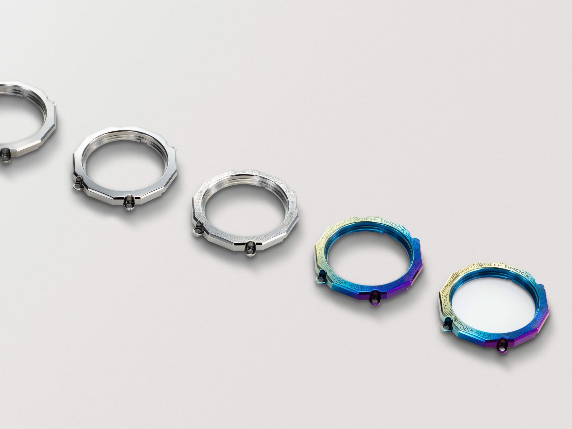 กรอบหน้าปัดสเตนเลสสตีลถูกตัดแต่งและขัดเงา จากนั้นจึงแกะสลัก และชุบอิออนสีรุ้งในขั้นตอนสุดท้าย ชวนให้นึกถึงภูมิทัศน์เมืองที่แวววาว
