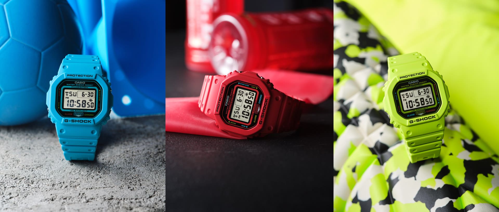 G-SHOCK 5600 ที่เป็นหนึ่งใน Iconic Styles สีน้ำเงิน สีแดง สีเขียว และสีเหลืองสดใส แสดงถึงความกระฉับกระเฉงที่เต็มเปี่ยม