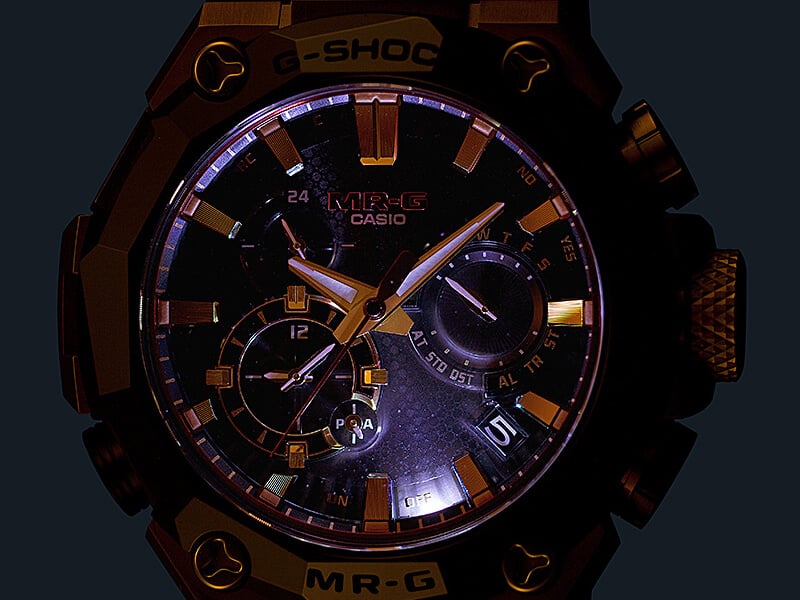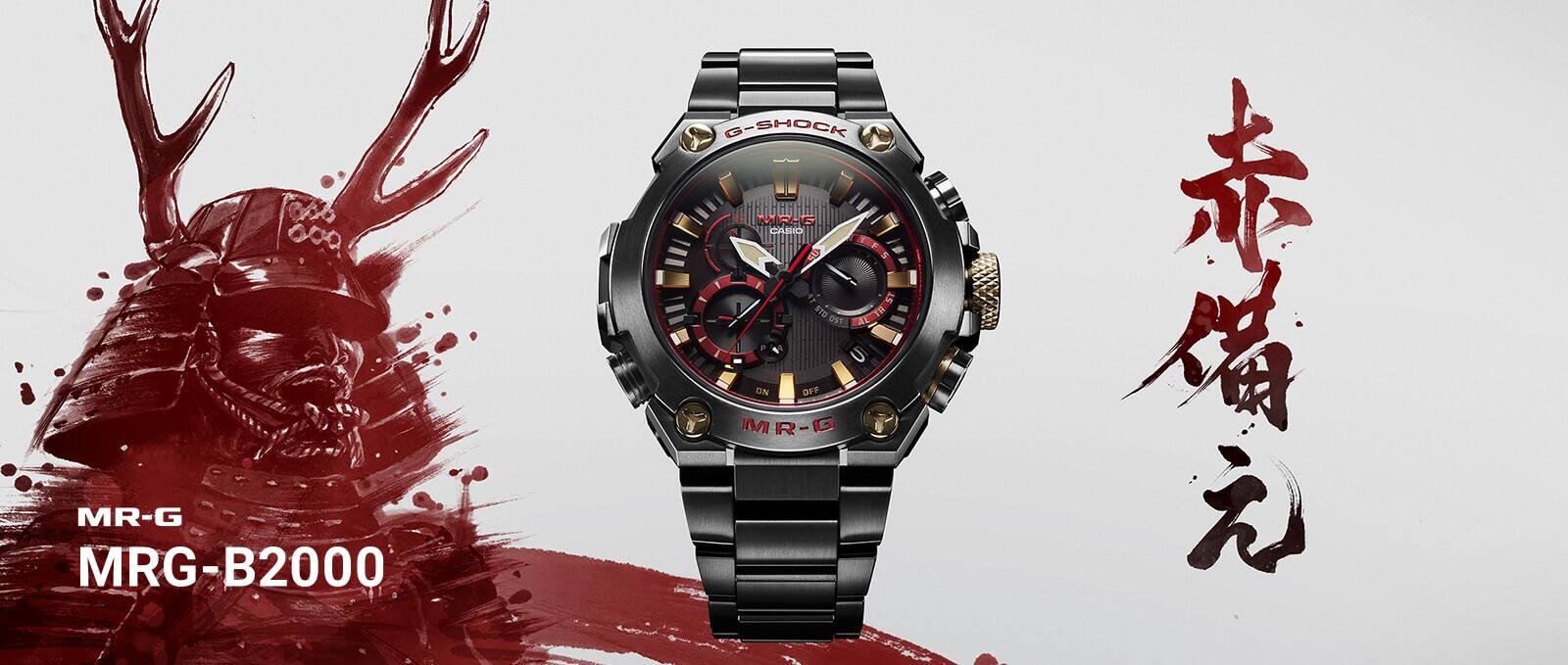 สีแดงเข้มที่เป็นสัญลักษณ์ของความแข็งแกร่งตั้งแต่อดีตได้นำมาใช้ใน MRG-B2000B-1A4 อย่างลงตัว โดยใช้ตามรูปแบบของญี่ปุ่นโบราณ การตกแต่งด้วยการสลักตัวอักษรที่กรอบและส่วนต่าง ๆ ของหน้าปัด รวมถึงการประกอบด้วยสกรูด้านหน้าและเม็ดมะยมที่ชุบเคลือบอิออนสีทอง เพื่อเสริมภาพของหมวกและชุดเกราะของผู้บังคับบัญชาในกองทัพซามูไร ทั้งนี้ สีดำของแบรนด์ G-SHOCK ได้ถูกนำมาใช้เพื่อเพิ่มความหนักและความทนทานให้กับผลิตภัณฑ์นี้อย่างเหมาะสม