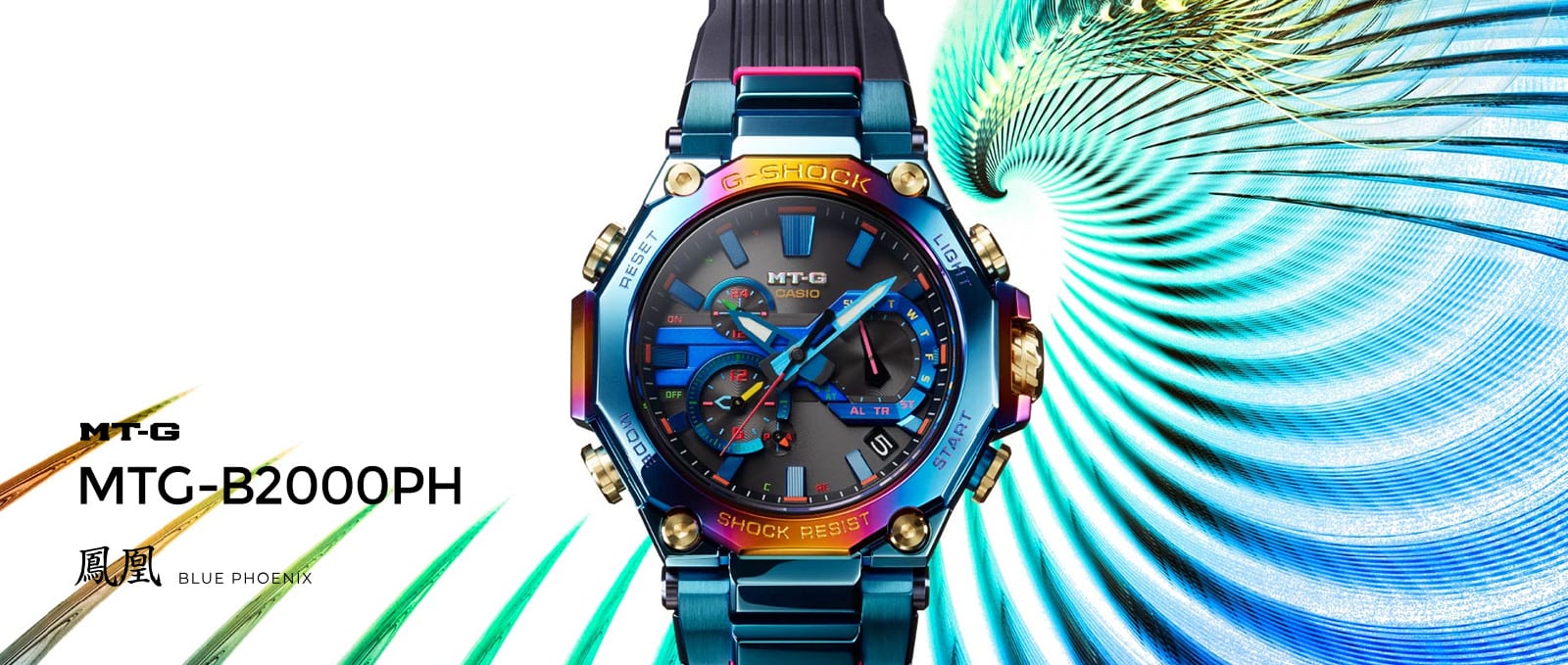 เรายินดีต้อนรับความงามที่ได้รับแรงบันดาลใจจาก Blue Phoenix รุ่นใหม่นี้มาสู่กลุ่มผลิตภัณฑ์นาฬิกา MT-G ซึ่งมีโครงสร้างป้องกันแกนกลางจากวัสดุ 2 แบบ ด้วย IP แบบสีรุ้งที่นำไปใช้กับกรอบโลหะได้อย่างโดดเด่น โมเดลจึงถ่ายทอดมุมมองโลกทัศน์ด้วยไหวพริบอันลี้ลับ หน้าปัดมีดีไซน์หลายสีเช่นกัน และสายนาฬิกาใช้เรซินสีน้ำเงินกรมท่าโปร่งแสง ความใส่ใจอย่างพิถีพิถันที่เราใส่ลงไปในวัสดุ สี และการตกแต่งทำให้ได้การนำเสนอที่คู่ควรกับนาฬิการุ่นพิเศษดังกล่าว