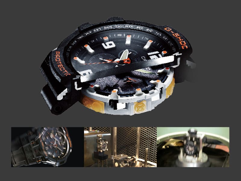 錶背和不鏽鋼管形成框架來保護內殼的構造。 G-SHOCK的中空外殼結構是以金屬外殼達成。