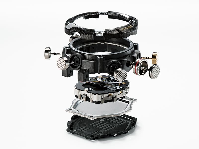 錶圈由輕巧、高剛性碳材料製成,採用顯微構造控制技術將最先進的碳纖維與樹脂相結合。