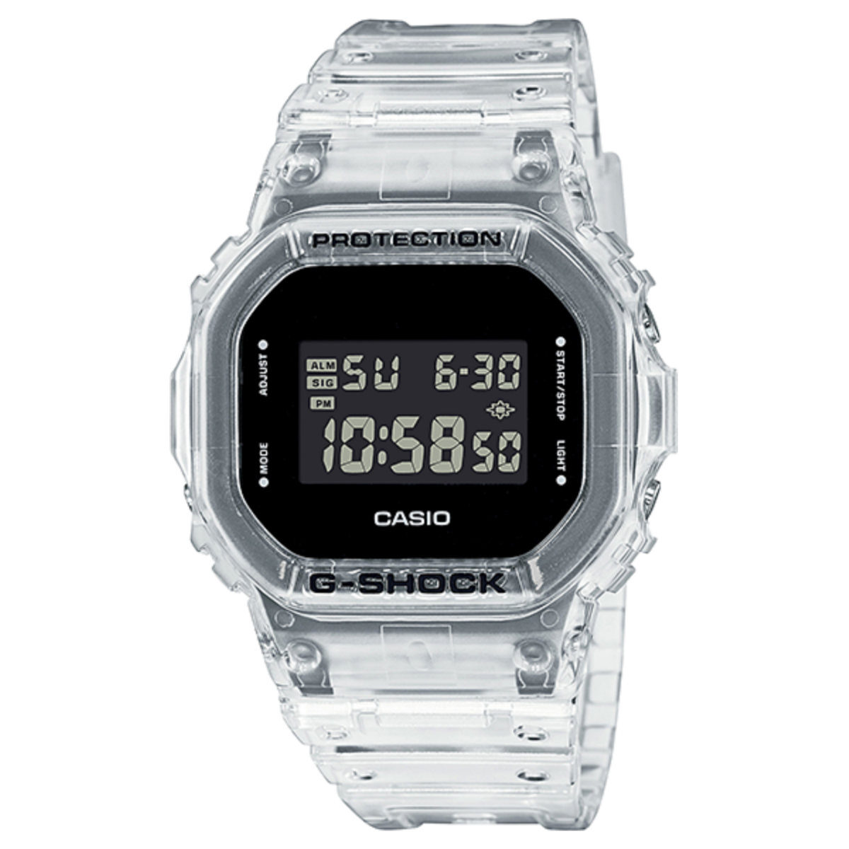 由透明樹脂零件組成的Skeleton系列。以經典的DW-5600方形型號為基礎,挑選清澈的白色為底色,整體色彩別緻,是日常好搭的時尚配件。
