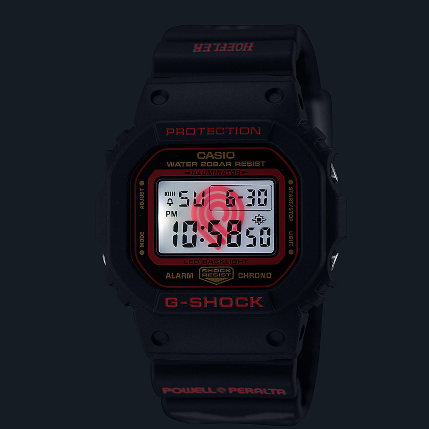 聯名錶款以G-SHOCK經典方形的DW-5600型號為基礎,融合了眾多Kelvin Hoefler和Powell Peralta的特色元素,呈現出濃厚的街頭風格。全錶以黑色作為主色調並以紅色點綴各處細節,樹脂錶帶部分印上Kelvin Hoefler的字樣與 Powell Peralta標誌性圖樣,錶盤按下LED 背光照明也看到 Powell Peralta Logo在顯示螢幕上出現,背蓋更是刻印Kelvin Hoefler的親筆簽名,搭配特殊的外盒包裝,使其成為街頭潮流文化愛好者的必備之選。DW-5600KH-1配備防水200米、耐衝擊、多元鬧鈴、碼錶功能滿足日常生活需求,並已於CASIO官方商城、實體通路CASIO概念店(Outlet除外)與指定經銷通路上市。