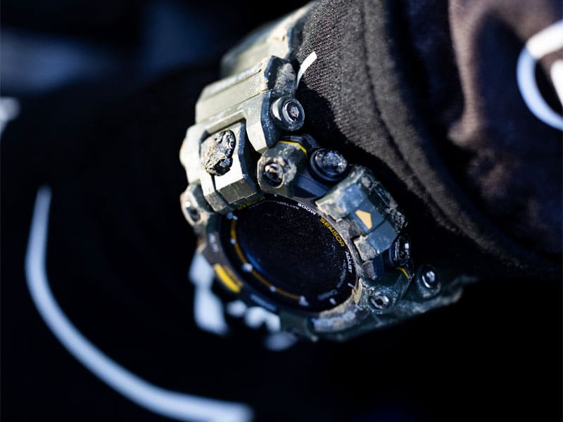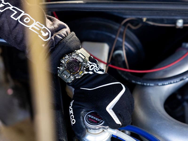 另一個值得注意的點是,GW-9500採用了雙層液晶顯示(雙層LCD),以提高指南針功能的可視性。 雙層LCD技術於2001年首次在G-SHOCK中使用,但當時的目的是作為設計重點,為顯示螢幕增添色彩。 然而,如果我們嘗試增加此功能,則需要將顯示螢幕做得更大,結果導致無法保證耐衝擊性。 為此,雙層液晶顯示螢幕的開發被擱置了很長一段時間,但隨著背蓋和外殼一體化的碳核心防護結構的開發,以增加耐衝擊能力,雙層LCD終於可以運用在G-SHOCK。 GW-9300上原本位於11點鐘位置小圓圈內的指南針現在顯示在整個錶面上,為新款MUDMAN提供了高可見度,讓您可以快速查看方位。 此外,GW-9500可以在更大的顯示螢幕上顯示高度、壓力/溫度,其三重感應器(還包括方位)為另一個亮點。 對於此演變,塙郁夫(Ikuo Hanawa)選手繼續在BAJA越野拉力賽1000、達卡拉力賽、亞洲越野拉力賽等世界最高越野賽事中與世界各地的戶外愛好者進行比賽。他說這在需要越多訊息的情況下尤其有用,例如比賽中因機器故障而陷入困境時。