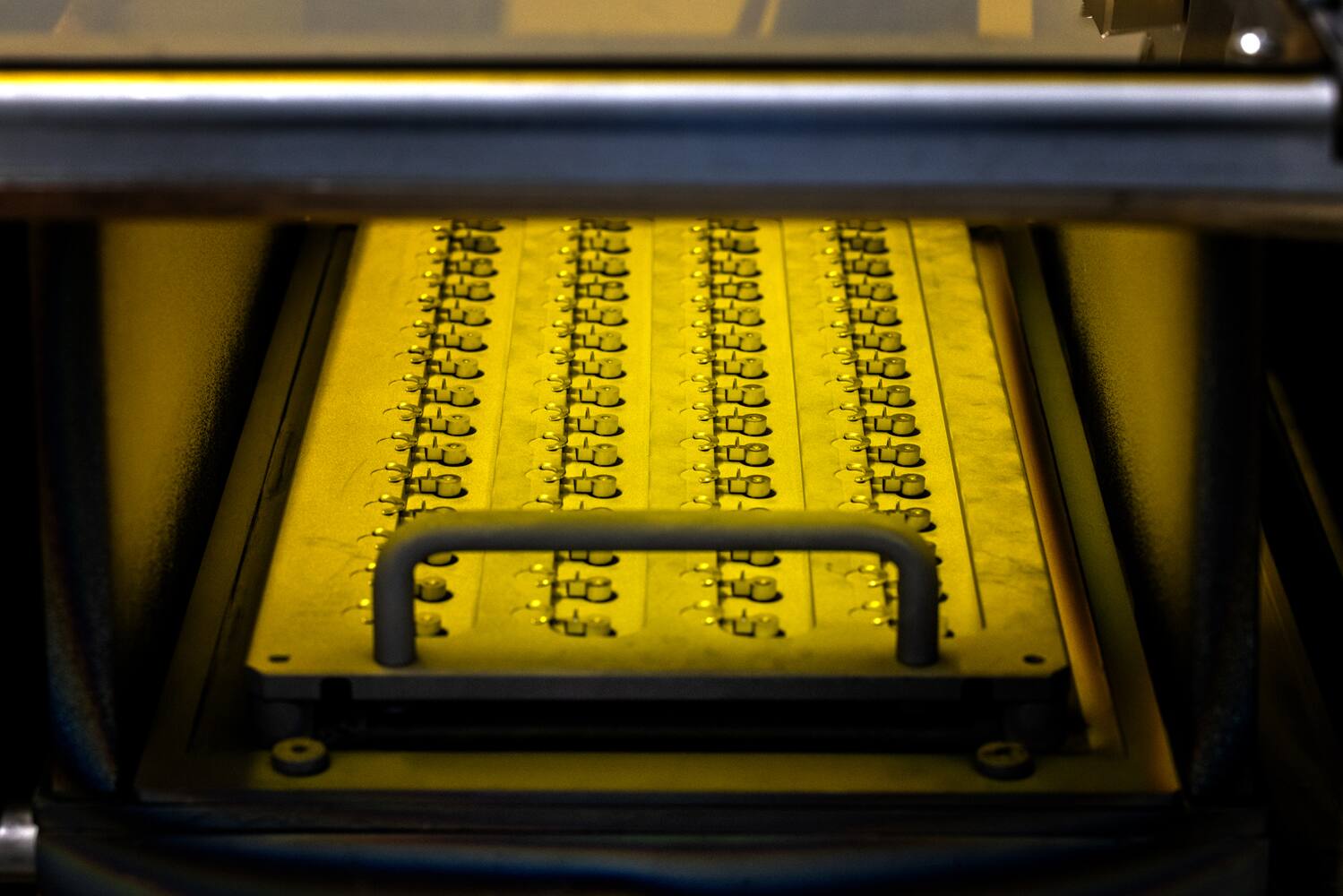 另一方面,位於錶盤9點鐘位置的半圓形錶盤零件始終由Yamagata Casio製造。首先,濺鍍處理在樹脂錶眼環零件上形成銀色膜。透過在其塗上一層薄薄的藍色塗料,我們獲得與全金屬G-SHOCK奢華而堅固的外觀相稱的深度和光澤。雖然它很小,只有小拇指大小,但它的存在極大地增強了GM-B2100AD的深邃錶盤表現力。