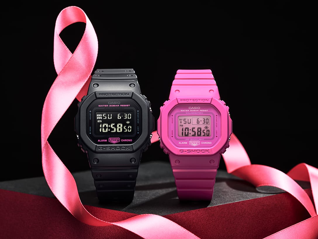 CASIO旗下G-SHOCK多年來致力於打造耐撞抗震又兼具潮流時尚的錶款,且不停追求突破分別向運動、時尚、音樂、藝術等各領域進行合作,近年來更是關心公益活動,除了長年與環保團體合作友愛地球外,今年的粉紅十月G-SHOCK再次推出以象徵乳癌防治的粉紅絲帶為靈感的全新對錶DW-5600PK-1與GMD-S5610PK-4,單隻建議售價為NT$3,200。今年台灣卡西歐同樣也將把粉紅絲帶對錶的部分營收,捐款給台灣乳癌防治基金會希望為台灣乳癌防治盡一份心力。然而在粉紅十月期間G-SHOCK也將在世界各地支持不同乳癌防治計畫,期望能幫助全球身陷乳癌的病友們突破困境,能早期發現,早期治療,戰勝乳癌。