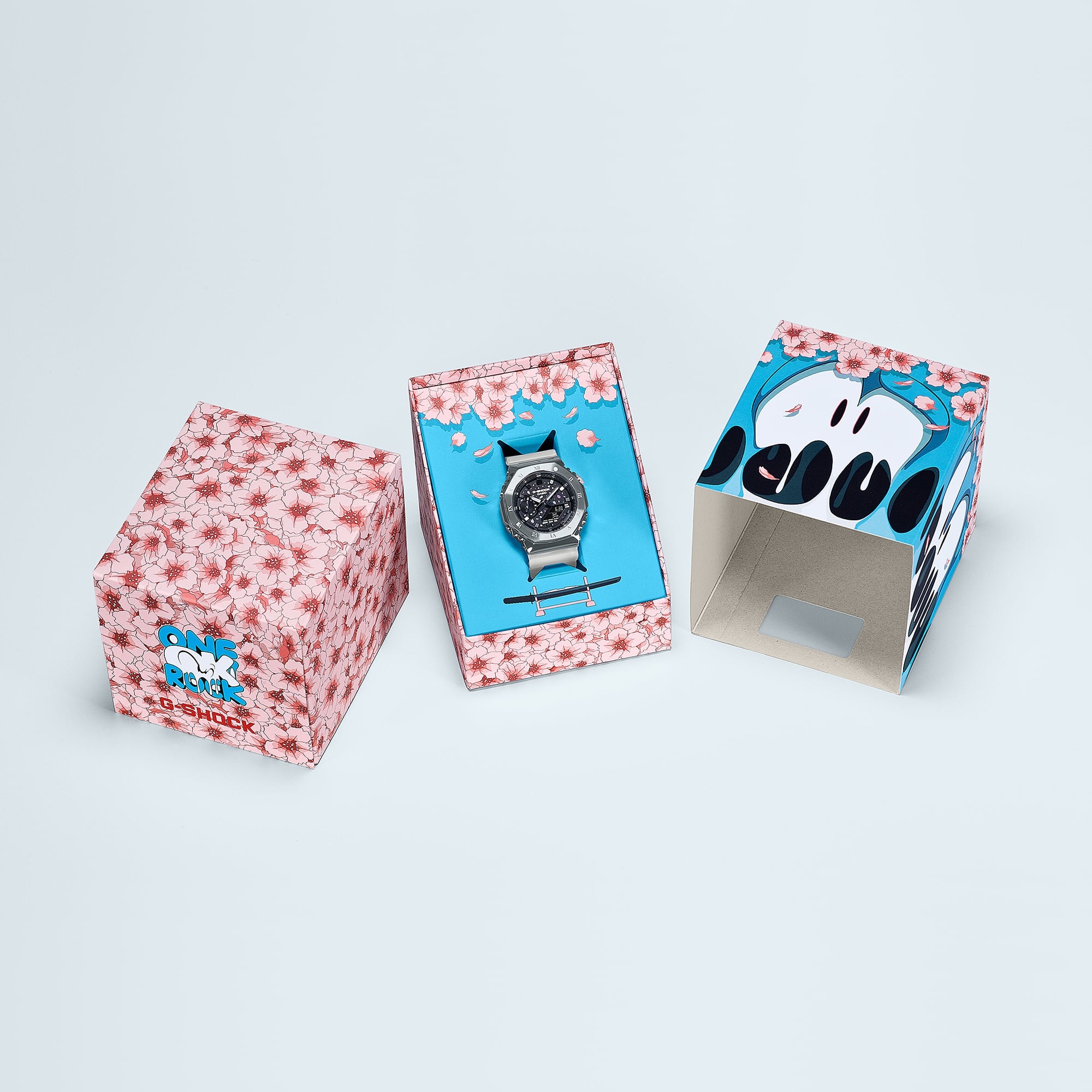 GM-2100TTTR以GM-2100為基礎型號,其具備獨特的銀色金屬八角形錶圈,搭配霧面半透明白色錶帶,完美融合剛毅與時尚美學。本次聯名外觀設計皆由ONE OK ROCK貝斯手Ryota親自監製,金屬錶圈上飾有羅馬數字時標,象徵回到時間原點,黑色錶盤搭配銀色蒸鍍刻度營造出強烈的視覺層次感。錶盤上飄散著細膩的櫻花漸變花瓣,展現優雅日式風情,而9點鐘位置的小錶眼則以武士刀為靈感,進一步強調日本文化元素。除了精緻的設計細節,聯名腕錶亦融入ONE OK ROCK的專屬元素,錶帶扣環巧妙地刻上Ryota的經典的紋身圖案,而背蓋則刻有樂團御用的瑞典藝術家Emil打造的ONE OK ROCK logo。為完整呈現本次聯名的精神,Emil更特別設計了專屬的特殊外盒包裝,如此融合潮流設計與ONE OK ROCK音樂靈魂的聯名,無疑是OORer (ONE OK ROCK粉絲)與腕錶愛好者不可錯過腕錶。