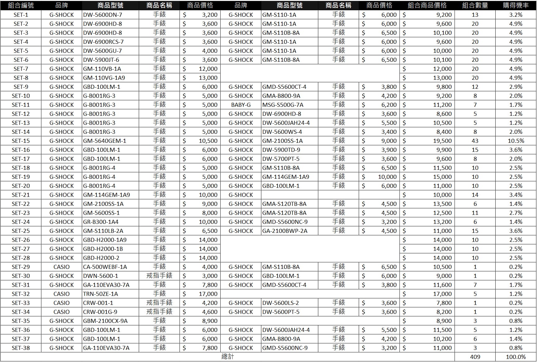 機率商品:詳列如下圖所示