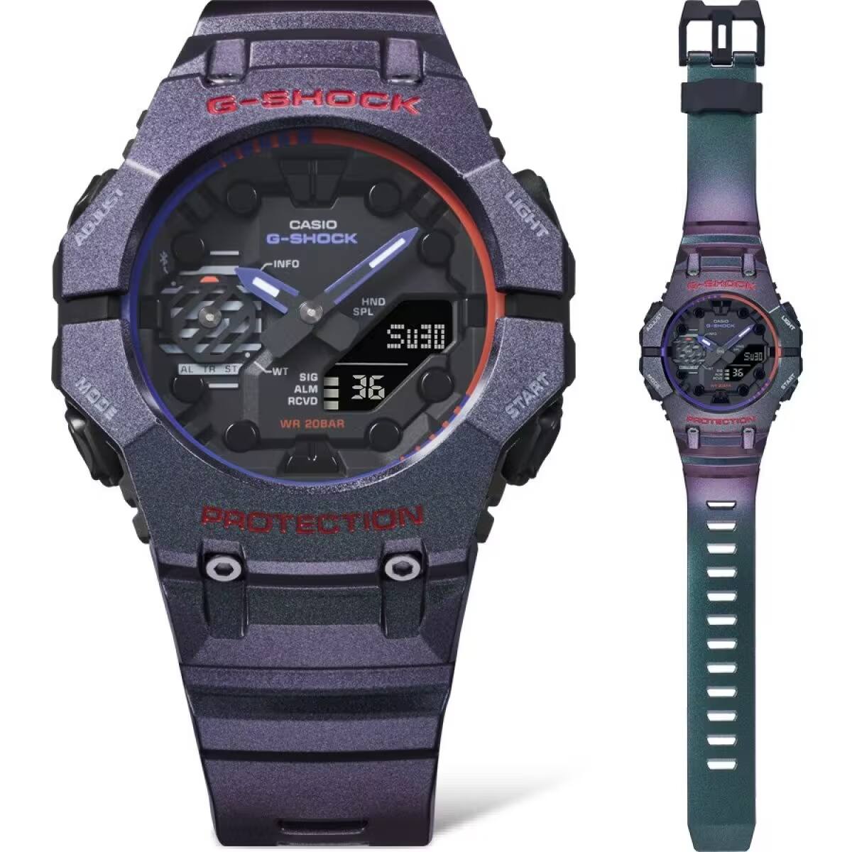 偏光色彩的使用靈感來自遊戲文化中的立體投影和影像表現中的漸層色彩呈現方式,讓顏色根據觀看錶圈和錶帶時的角度產生變化。紫色與綠色漸層體現了數位玩家在現實和虛擬世界之間無縫穿梭的生活風格。