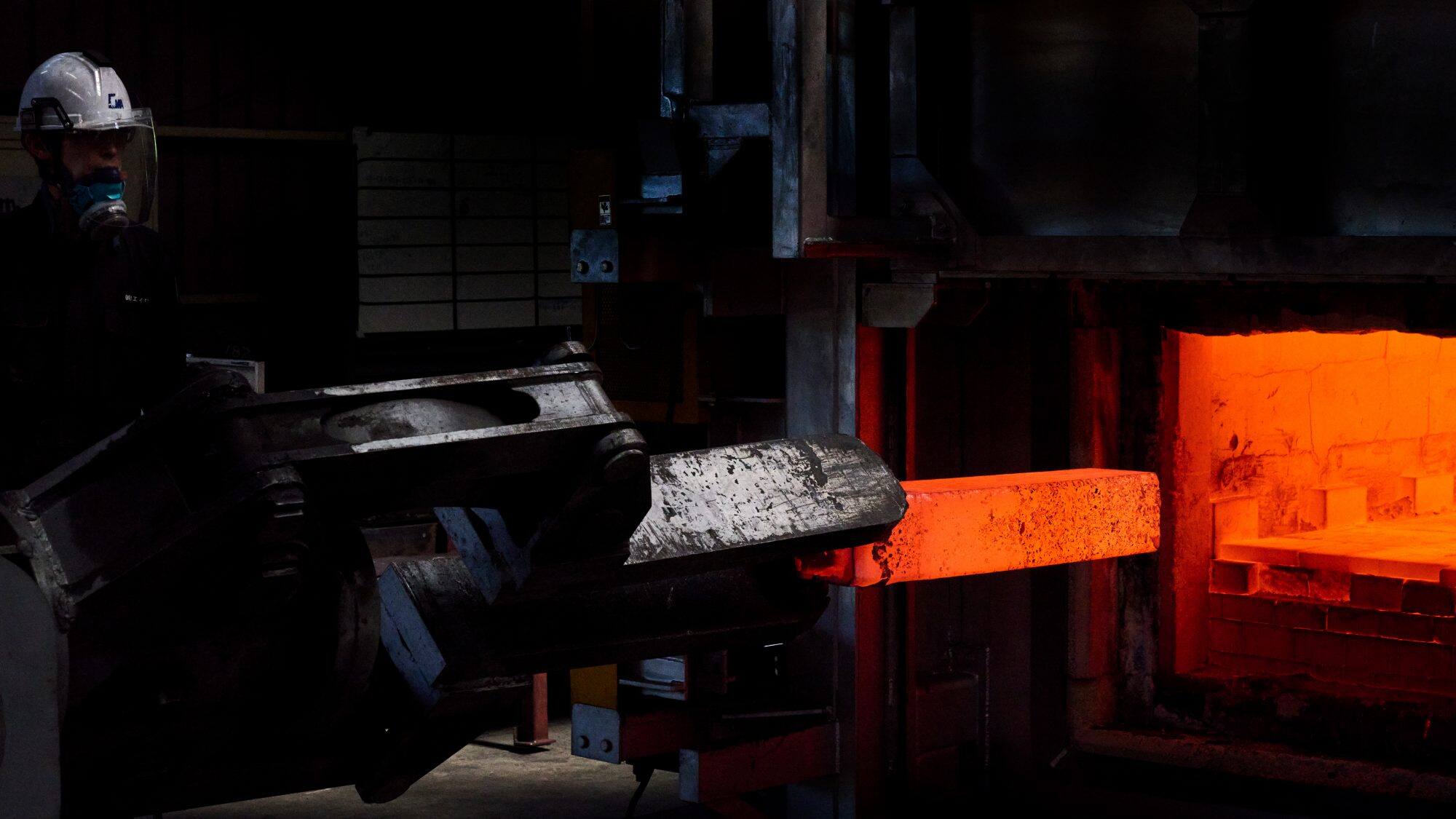 目前所形成的鑄錠再次被加熱到超過 1000°C 的高溫。接著,為了提高其硬度,會使用 600 噸的液壓機反覆加以錘擊並壓縮,過程中也因此而火花四濺。為了避免材料出現任何裂紋,在這些鍛造過程中必須非常仔細地留意溫度和鍛打鑄錠的次數等因素。