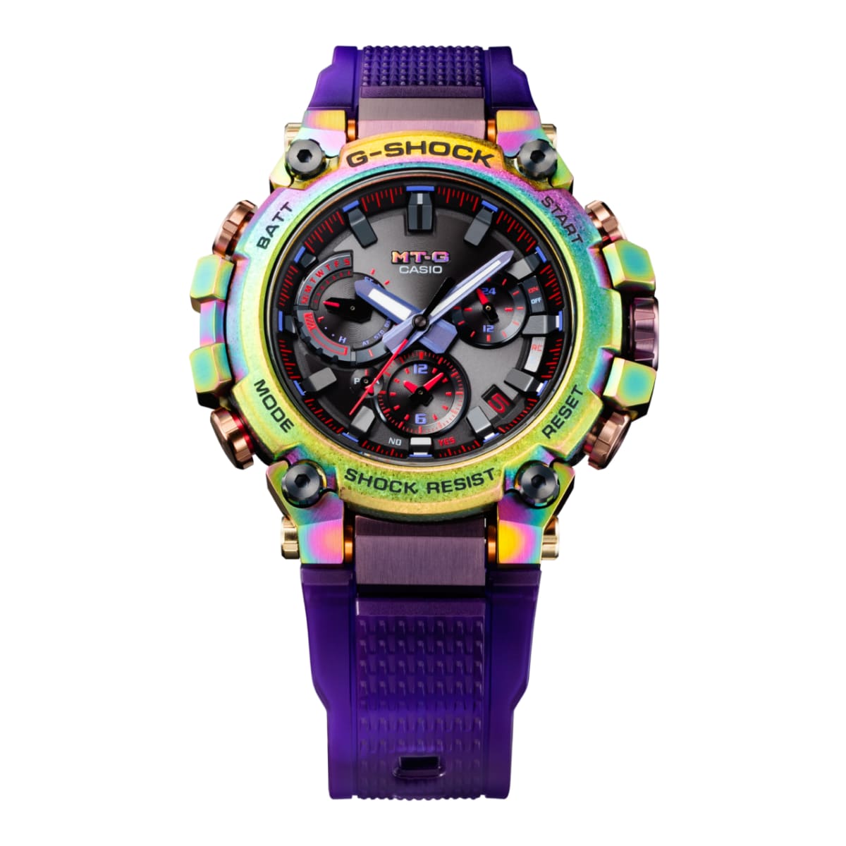 不鏽鋼再結晶與深度硬化工藝打造的質感,閃耀神秘的彩虹離子IP鍍膜等大膽創意與細膩工藝,以MT-G獨有深邃有力的美感打造出奪目的外觀。