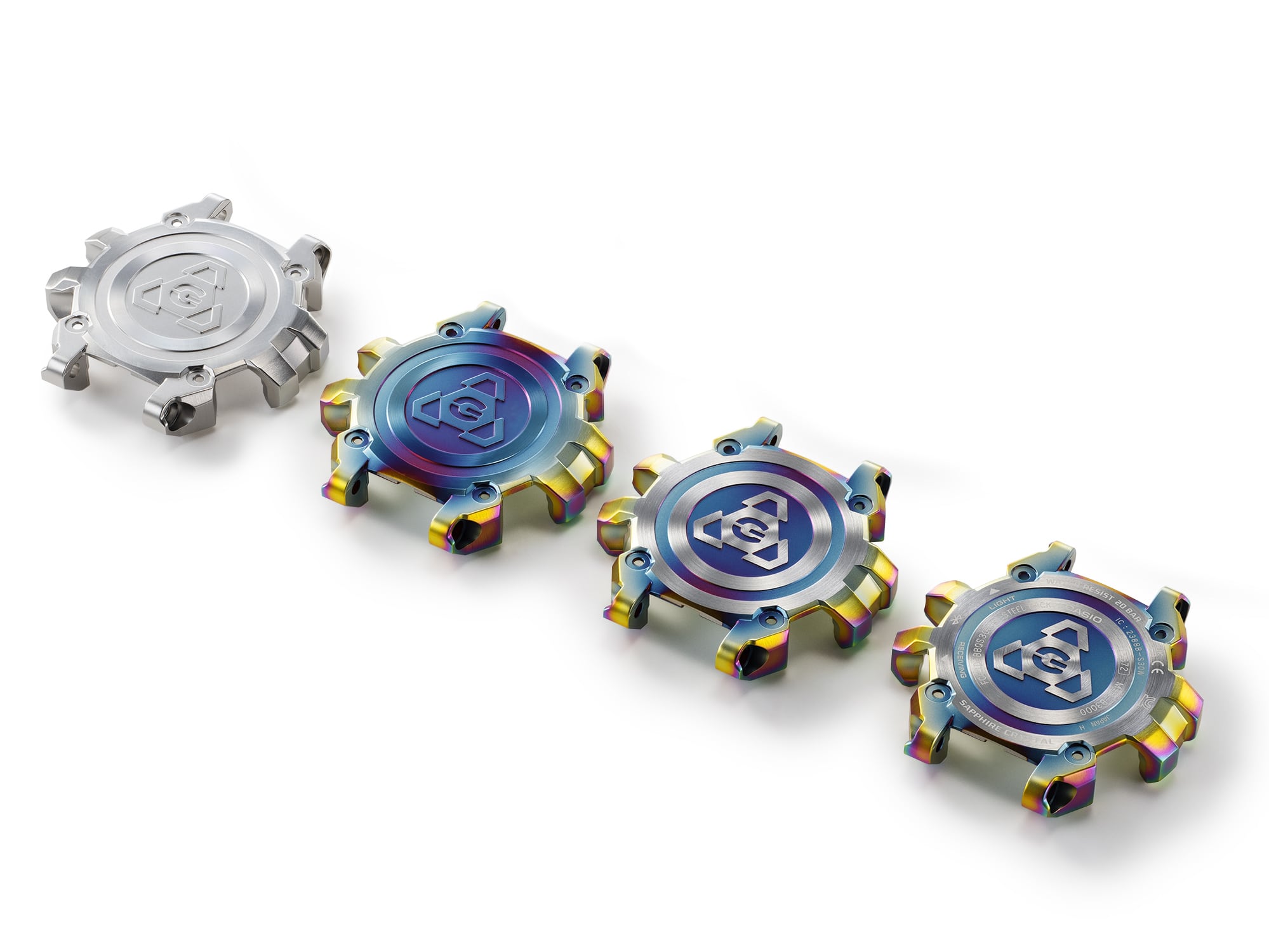 形狀複雜的背蓋具有凸起的側邊,與頂層錶圈相互嵌合,打造出呈現深邃外觀的精緻金屬外殼。採用一體成型技術,透過鍛造、切削和拋光的反覆工序實現高硬度。此外,透過在材料表面塗覆七彩離子鍍膜塗層,並使用重新拋光工藝僅去除錶殼背蓋凸起部分的塗層,創造出特殊且獨有的飾面。這種獨特的設計技術會將金屬原有的閃亮光澤與變幻色調的多彩混合物結合。