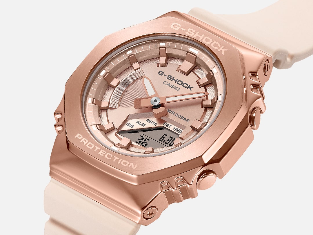 兩款最受歡迎的輕巧型G-SHOCK型號現已推出新顏色。 金屬錶圈採用華麗的粉紅金離子IP鍍膜,樹脂錶帶採用優雅的粉米色。