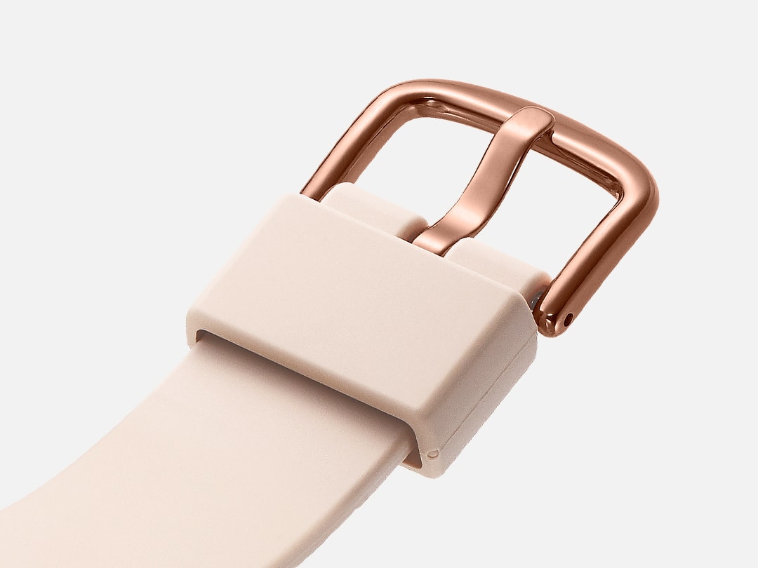 金屬錶圈和錶扣採用優雅的粉紅金離子IP鍍膜,而樹脂錶帶則採用粉米色。錶盤採用協調的色調,呈現出一款華麗優雅,帶有柔和單色調的手錶。
