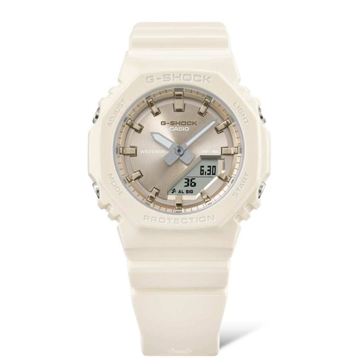 GMA-P2100系列加入了一款具有絲綢般質感的新型號,其特點是體積小、外觀簡潔。錶圈和錶帶均塗有霧面偏光珠光塗層,錶盤飾有柔和的霧面金屬色。柔和的色彩和微妙的光澤為您的手腕增添優雅氣息。